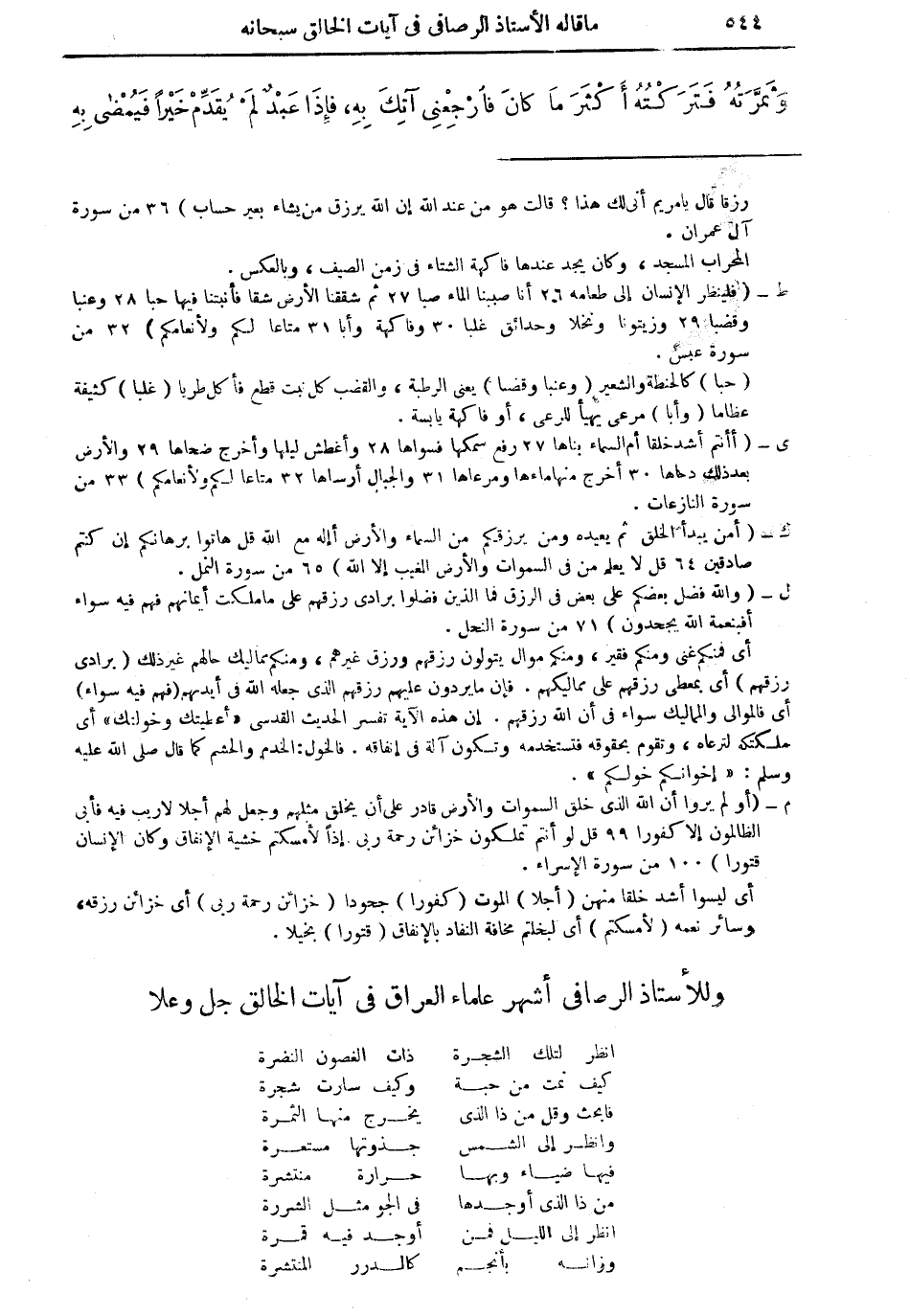 وللأستاذ الرصافي أشهر علماء العراق في آيات الخالق جلّ وعلا