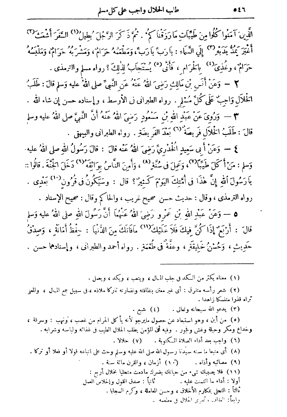 2 - وعن أنس بن مالكٍ رضي الله عنه عن النبي صلى الله عليه وسلم قال: طلب الحلال واجب على كلِّ مسلمٍ. رواه الطبراني في الأوسط، وإسناده حسن إن شاء الله.