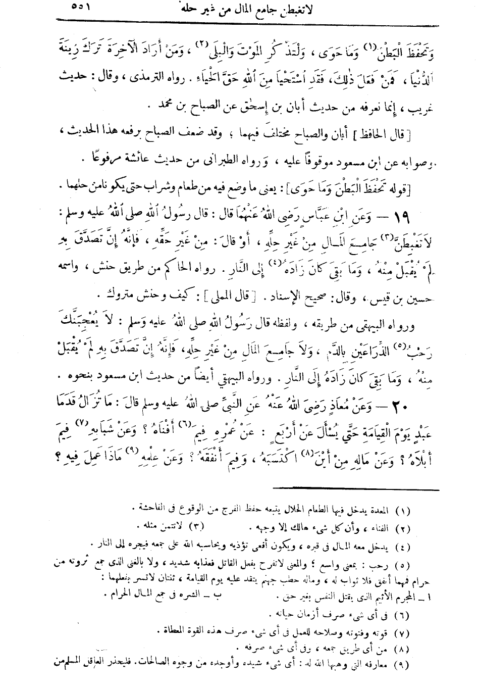 20 - وعن معاذٍ رضي الله عنه عن النبي صلى الله عليه وسلم قال: ما تزال قدما عبدٍ يوم القيامة حتى يسأل عن أربعٍ: عن عمره فيم (¬6) أفناه؟ وعن شبابه (¬7) فيم أبلاه؟ وعن ماله من أين (¬8) اكتسبه، وفيم أنفقه؟ وعن علمهِ (¬9) ماذا فيه؟ رواه