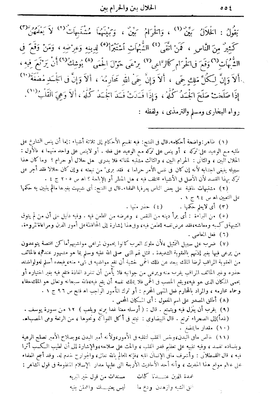 (¬7) ضرب على سبيل التمثيل، لأن ملوك العرب كان يحمون لمراعي مواشيهم أماكن مختصة يتوعدون من يرعى فيها بغير إذنهم بالعقوبة الشديد .. فمثل لهم النبي صلى الله عليه وسلم بما هو مشهور عندهم، فالخائف من العقوبة المراقب لرضا الملك يبعد عن ذلك الحمى خشية أن تقع مواشيه في شيء منه، فبعده أسلم له، ولو اشتد حذره، وغير الخائف المراقب يقرب منه، ويرعى من جوانبه فلا يأمن أن تنفرد الفاذة فتقع فيه بغير اختياره أو يحمي المكان الذي هو فيه، ويقع الخصب في الحمى فلا يملك نفسه أن يقع فيه، فالله سبحانه وتعالى هو الملك حقا، وحماه محارمه، والمراد بالمحارم فعل المنهي المحرم: أو ترك المأمور الواجب أهـ فتح ص 96 جـ 1.