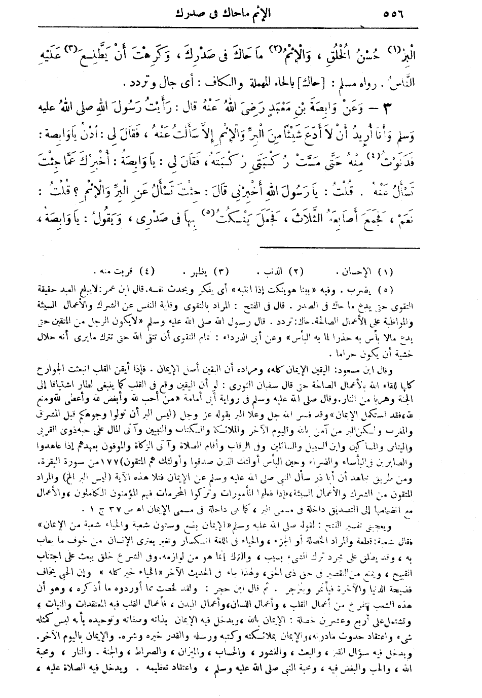البرُّ (¬1) حسن الخلق، والإثم (¬2) ما حاك في صدرك، وكرهت أن يطَّلع (¬3) عليه الناس. رواه مسلم: (حاك) بالحاء المهملة والكاف: أي جال وتردد.