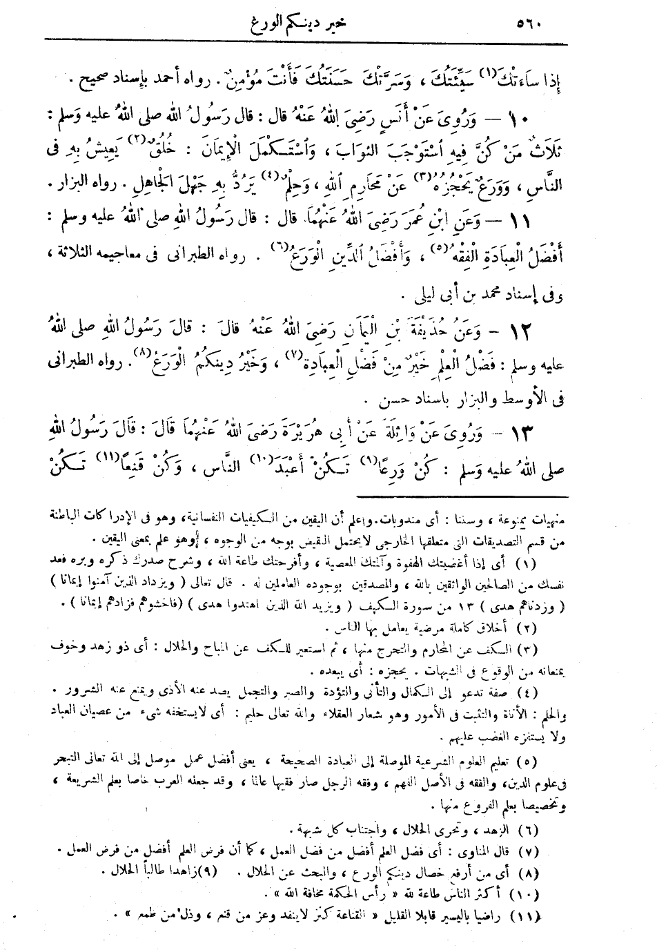 12 - وعن حذيفة بن اليمان رضي الله عنه قال: قال رسول الله صلى الله عليه وسلم: فضل العلم خيرٌ من فضل العبادة (¬7)، وخير دينكم الورع (¬8). رواه الطبراني في الأوسط والبزار بإسناد حسن.