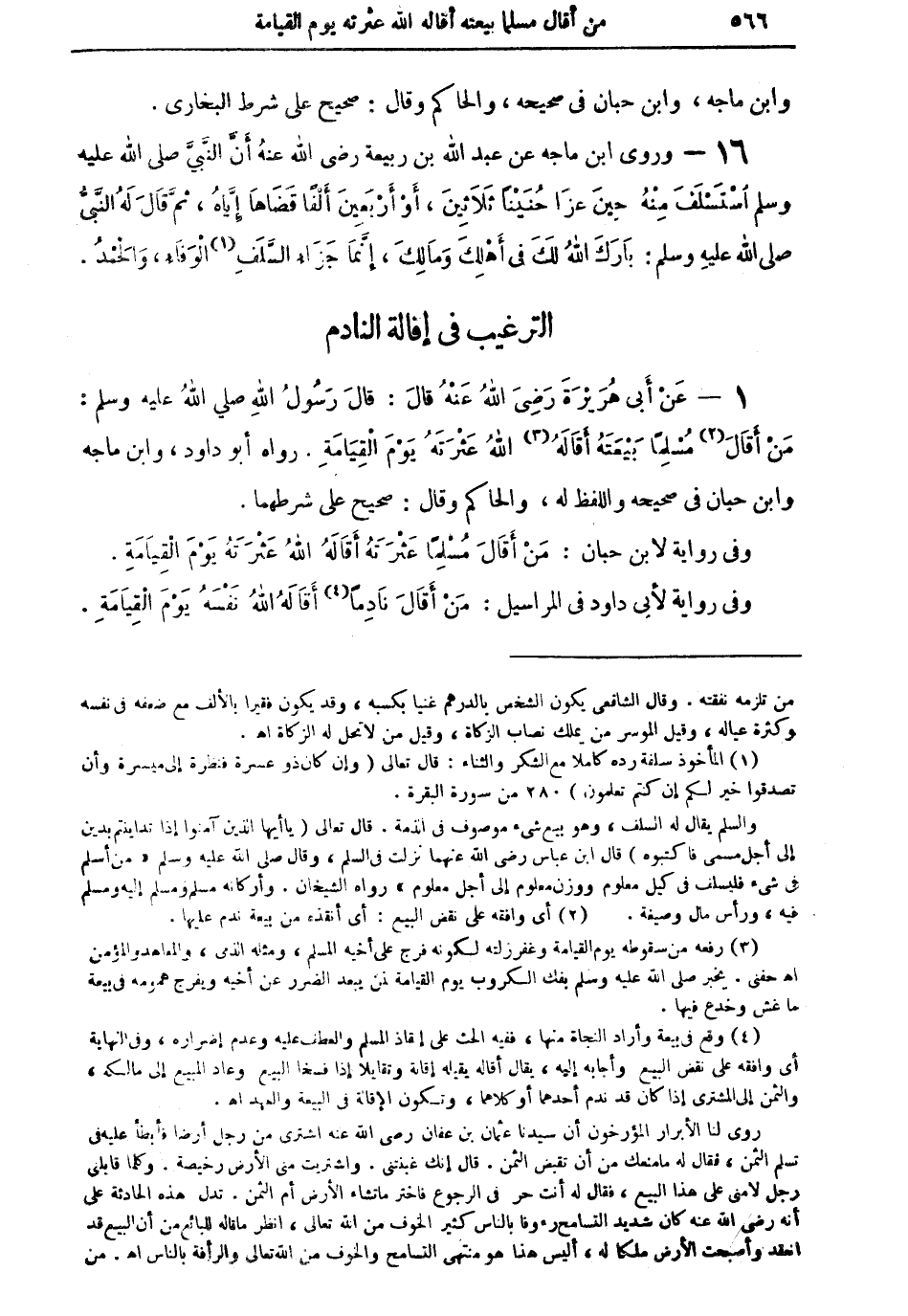1 - عن أبي هريرة رضي الله عنه قال: قال رسول الله صلى الله عليه وسلم: من أقال (¬2) مسلماً بيعته أقاله (¬3) الله عثرته يوم القيامة. رواه أبو داود، وابن ماجه وابن حبان في صحيحه واللفظ له، والحاكم وقال: صحيح على شرطهما.