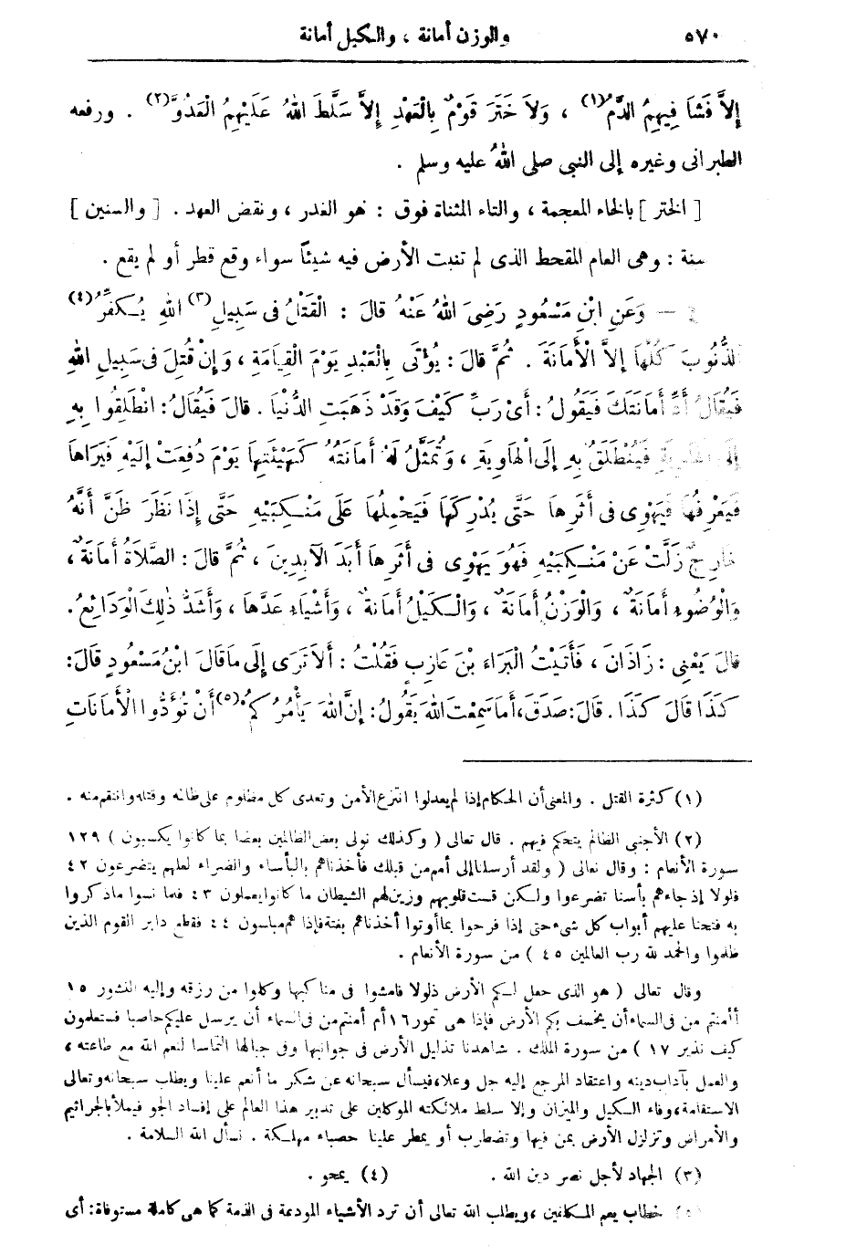 4 - وعن ابن مسعودٍ رضي الله عنه قال: القتل في السبيل (¬3) الله يكفِّر (¬4) الذنوب كلها إلا الأمانة. ثمَّ قال: يؤْتي بالعبد يوم القيامة، وإن قتل في سبيل الله فيقال أدِّ أمانتك فيقول: يا ربِّ كيف وقد ذهبت الدنيا. قال فيقال: انطلقوا به إلى الهاوية فينطلق به إلى الهاوية، وتمثَّل له أمانته كهيئتها يوم دفعت إليه فيراها فيعرفها فيهوى في أثرها حتى يدركها فيحملها على منكبيه حتى إذا نظر ظنَّ أنه خارجٌ زلَّت عن منكبيه فهو يهوى في أثرها أبد الآبدين، ثمَّ قال: الصلاة أمانة، والوضوء أمانةٌ، والوزن أمانة. والكيل أمانة، وأشياء عدَّها، وأشدُّ ذلك الودائع.