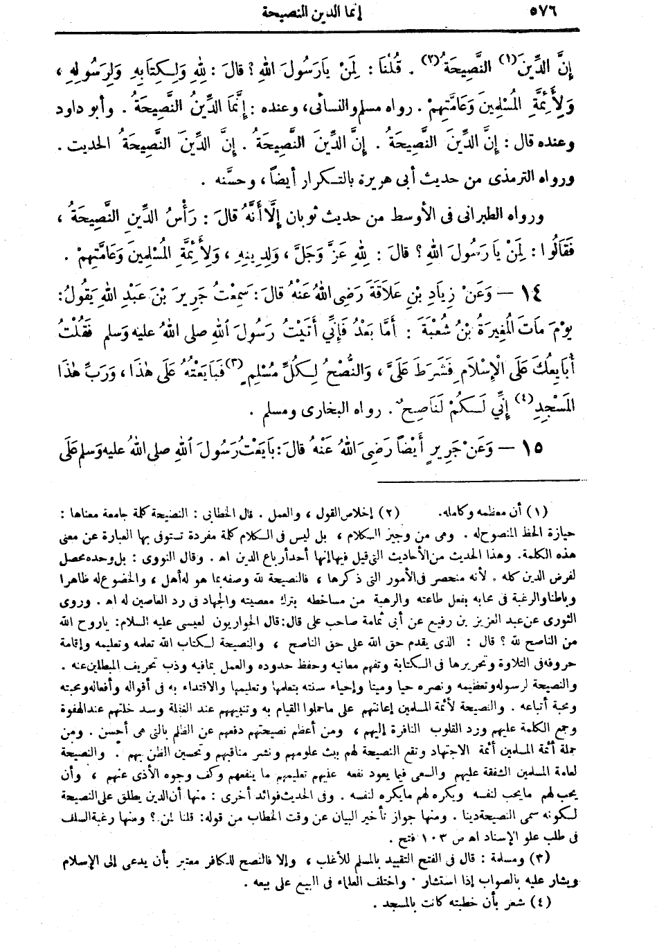 قلنا: لمن يا رسول الله؟ قال: لله ولكتابه ولرسوله، ولأئمَّة المسلمين وعامَّتهمْ. رواه مسلم والنسائي. وعنده: إنما الدين النصيحة. وأبو داود، وعنده قال: إنَّ الدين النصيحة. إن الدين النصيحة. إن الدين النصيحة الحديث. ورواه الترمذي من حديث أبي هريرة بالتكرار أيضاً، وحسَّنه.