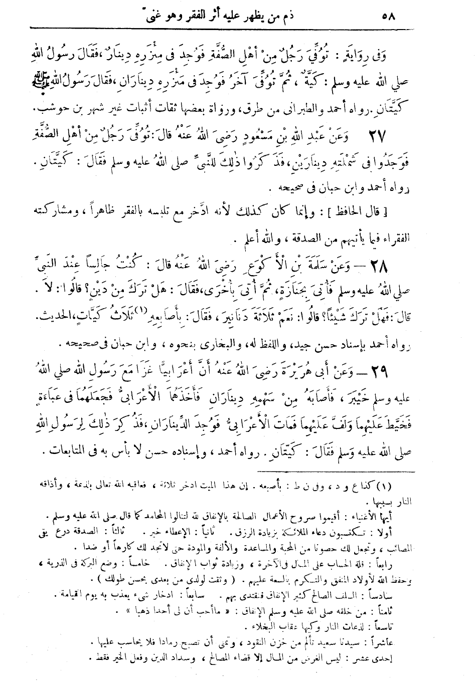 27 - وعنْ عبد الله بن مسعود رضي الله عنه قال: تُوفِّي رجلٌ من أهل الصُّفَّةِ فوجدوا في شملتهِ دينارين، فذكروا ذلك للنبيِّ صلى الله عليه وسلم فقال: كيَّتانِ.