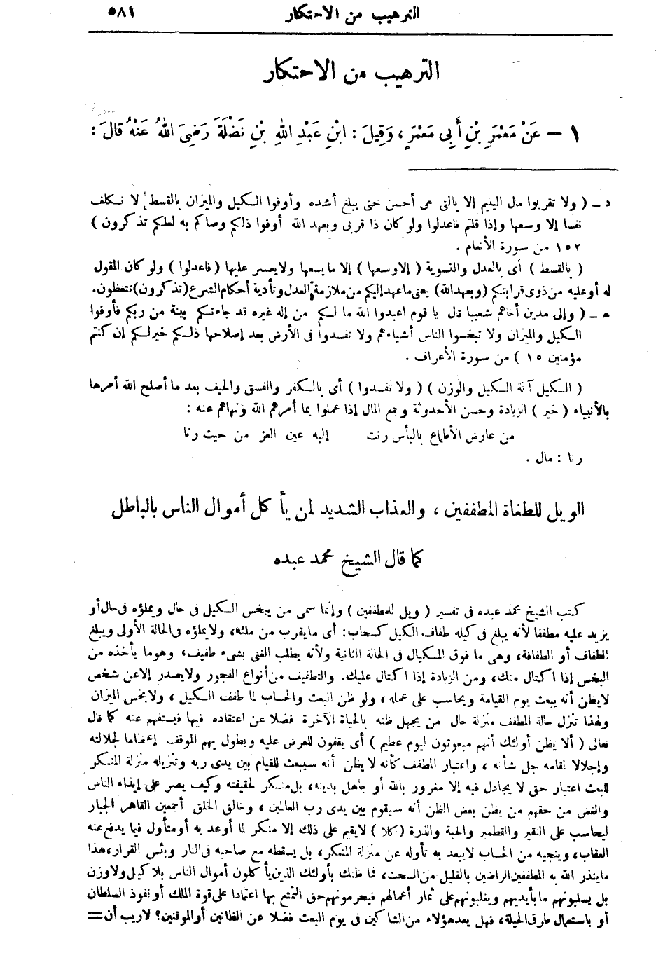 كتب الشيخ محمد عبده في تفسير (ويل للمطففين) وإنما سمي من يبخس الكيل في حال ويملؤه في حال أو يزيد عليه مطففا لأنه يبلغ في كيله طفاف الكيل كسحاب: أي ما يقرب من ملئه، ولا يملؤه في الحالة الأولى ويبلغ الطفاف أو الطفافة، وهي ما فوق المكيال في الحالة الثانية ولأنه يطلب الغني بشيء طفيف، وهو ما يأخذه من البخس إذا اكتال منك، ومن الزيادة إذا اكتال عليك. والتطفيف من أنواع الفجور ولا يصدر إلا عن شخص لا يظن أنه يبعث يوم القيامة ويحاسب على عمله، ولو ظن البعث والحساب لما طفف الكيل، ولا بخس الميزان ولهذا تنزل حالة المطفف منزلة حال من يجهل ظنه بالحياة الآخرة فضلا عن اعتقاده فيها فيستفهم عنه كما قال تعالى (ألا يظن أولئك أنهم مبعوثون ليوم عظيم) أي قفون للعرض عليه ويطول بهم الموقف إعظاما لجلالته وإجلاله لمقامه جلّ شأنه، واعتبار المطفف كأنه لا يظن أنه يبعث للقيام بين يدي ربه وتنزيله منزلة المنكر للبعث اعتبار حق لا يجادل فيه إلا مغرور بالله أو جاهل بدينه، بل منكر لحقيقته وكيف يصر على إيذاء الناس والغض من حقهم من يظن بعض الظن أنه سيقوم بين يدي رب العالمين، وخالق الخلق أجمعين القاهر الجبار ليحاسب على النقير والقطمير والحبة والذرة (كلا) لا يقيم على ذلك إلا منكر لما أوعد به أو متأول فيما يدفع عنه العقاب، وينجيه من الحساب لا يبعد به تأوله من منزلة المنكر، بل يسقطه مع صاحبه في النار وبئس القرار، هذا ما ينذر الله به المطففين الراضين بالقليل من السحت، فما ظنك بأولئك الذين يأكلون أموال الناس بلا كيل ولا وزن، بل يسلبونهم ما بأيديهم ويغلبونهم على ثمار أعمالهم فيحرمونهم حق التمتع بها اعتمادا على قوة الملك أو نفوذ السلطات أو باستعمال طرق الحيلة، فهل يعد هؤلاء من الشاكين في يوم البعث فضلا عن الظنانين أو الموقنين؟ لا ريب أن =
