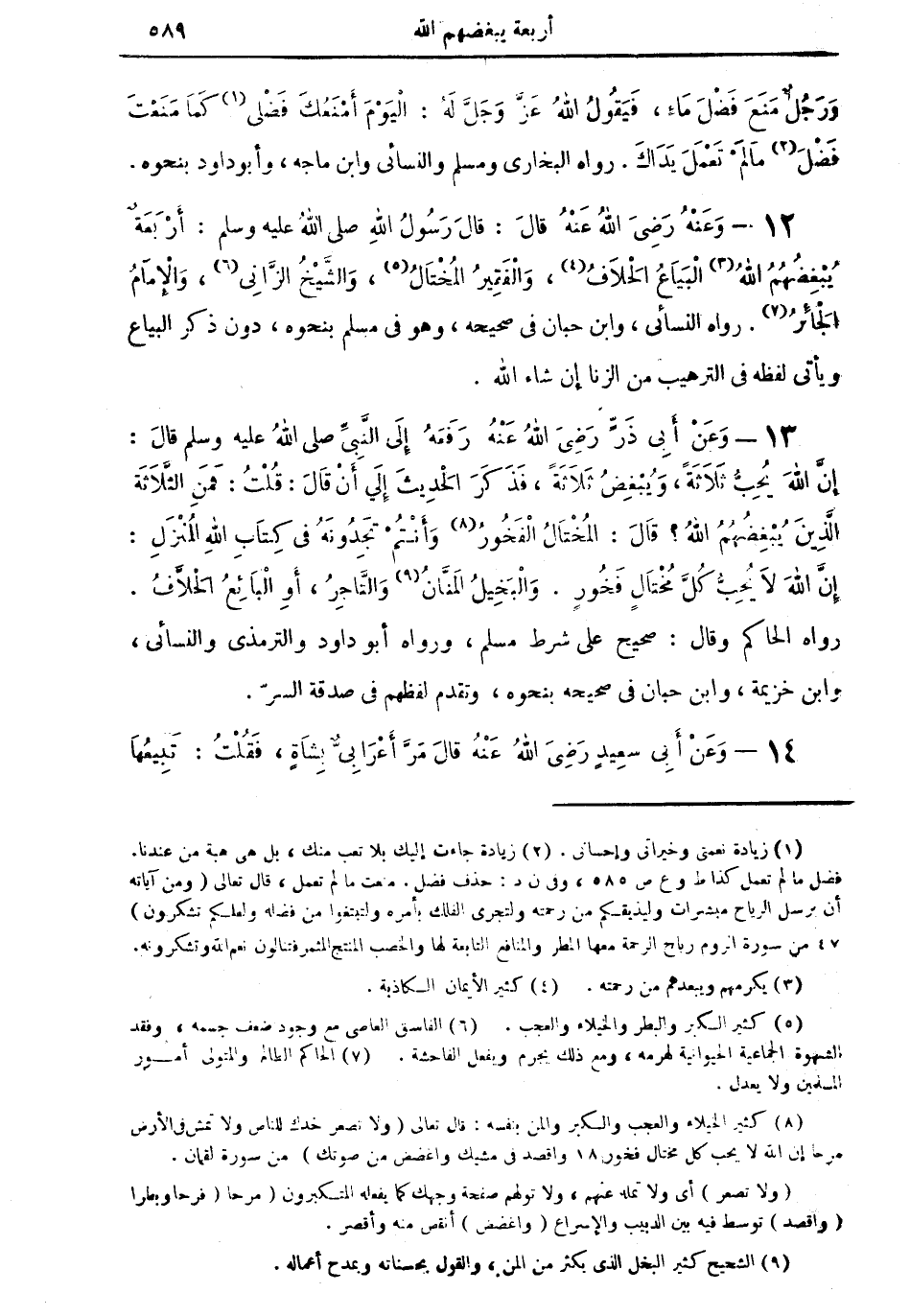 12 - وعنه رضي الله عنه قال: قال رسول الله صلى الله عليه وسلم: أربعة يبغضهم الله (¬3): البيَّاع الحلاف (¬4)، والفقير المختال (¬5)، والشَّيخ الزَّاني (¬6)، والإمام الجائر (¬7). رواه النسائي، وابن حبان في صحيحه، وهو في مسلم بنحوه، دون ذكر البياع ويأتي لفظه في الترهيب من الزنا إن شاء الله.