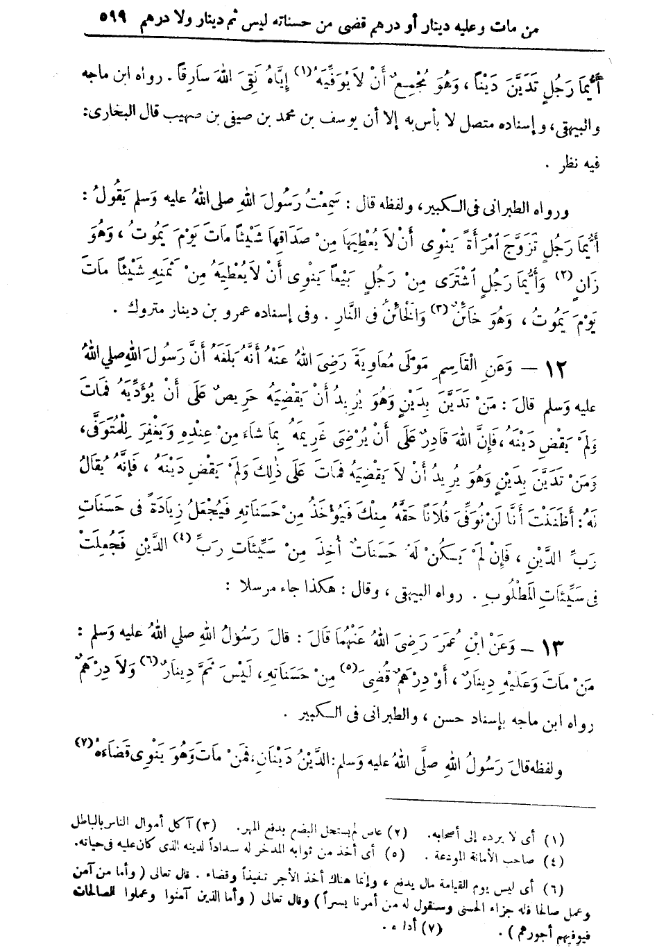 12 - وعن القاسم مولى معاوية رضي الله عنه أنَّه بلغه أن رسول الله صلى الله عليه وسلم قال: من تديَّن بدينٍ وهو يريد أن يقضيه حريصٌ على أنَّ يؤديه فمات ولمْ يقض دينه، فإن الله قادرٌ على أن يرضي غريمه بما شاء من عنده ويغفر للمتوفي، ومن تدين بدينٍ وهو يريد ألا يقضيه فمات على ذلك ولم يقض دينه، فإنَّه يقال له: أظننت أنا لن نوفي فلاناً حقه منك فيؤخذ من حسناته فيجعل زيادة في حسنات ربِّ الدَّين، فإن لم يكن له حسناتٌ أخذ من سيئات ربِّ (¬4) الدَّين فجعلت في سيئات المطلوب. رواه البيهقي، وقال: هكذا جاء مرسلا.