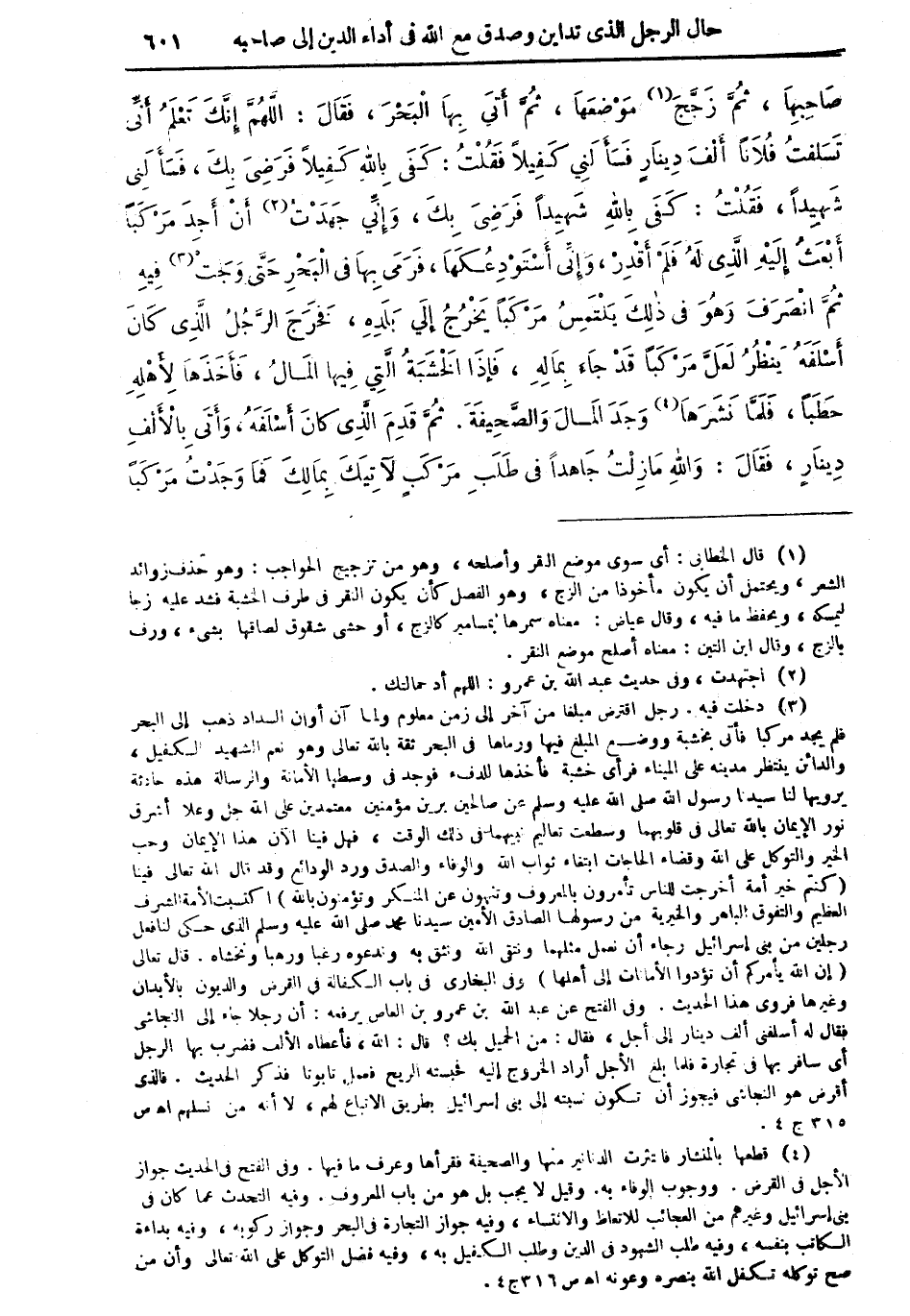 (¬3) دخلت فيه. رجل اقترض مبلغاً من آخر إلى زمن معلوم ولما آن أوان السداد ذهب إلى البحر فلم يجد مركبا فأتى بخشبة ووضع المبلغ فيها ورماها في البحر ثقة بالله تعالى وهو نعم الشهيد الكفيل، والدائن ينتظر مدينه على الميناء فرأى خشبة فأخذها للدفء فوجد في وسطها الأمانة والرسالة. هذه حادثة يرويها لنا سيدنا رسول الله صلى الله عليه وسلم عن صالحين برين مؤمنين معتمدين على الله جل وعلا أشرق نور الإيمان بالله تعالى في قلوبهما وسطعت تعاليم نبيهما في ذلك الوقت، فهل فينا الآن هذا الإيمان وحب الخير والتوكل على الله وقضاء الحاجات ابتغاء ثواب الله والوفاء والصدق ورد الودائع وقد قال الله تعالى فينا (كنتم خير أمة أخرجت للناس تأمرون بالمعروف وتنهون عن المنكر وتؤمنون بالله) اكتسب الأمة الشرف العظيم والتفوق الباهر والخيرية من رسولها الصادق الأمين سيدنا محمد صلى الله عليه وسلم الذي حكى لنا فعل رجلين من بني إسرائيل رجاء أن نعمل مثلهما ونتقي الله ونثق به وندعوه رغبا ورهبا ونخشاه .. قال تعالى (إن الله يأمركم أن تؤدوا الأمانات إلى أهلها) وفي البخاري في باب الكفالة في القرض والديون بالأبدان وغيرها فروي هذا الحديث. وفي الفتح عن عبد الله ابن عمرو بن العاص يرفعه: أن رجلا جاء إلى النجاشي فقال له أسلفني ألف دينار إلى أجل، فقال: من الحميل بك؟ قال: الله، فأعطاه الألف فضرب بها الرجل: أي سافر بها في تجارة فلما بلغ الأجل أراد الخروج إليه فحسبته الريح فعمل تابوتا فذكر الحديث. فالذي أقرض هو النجاشي فيجوز أن تكون نسبته إلى بني إسرائيل بطريق الاتباع لهم، لا أنه من نسلهم أهـ ص 315 جـ 4.