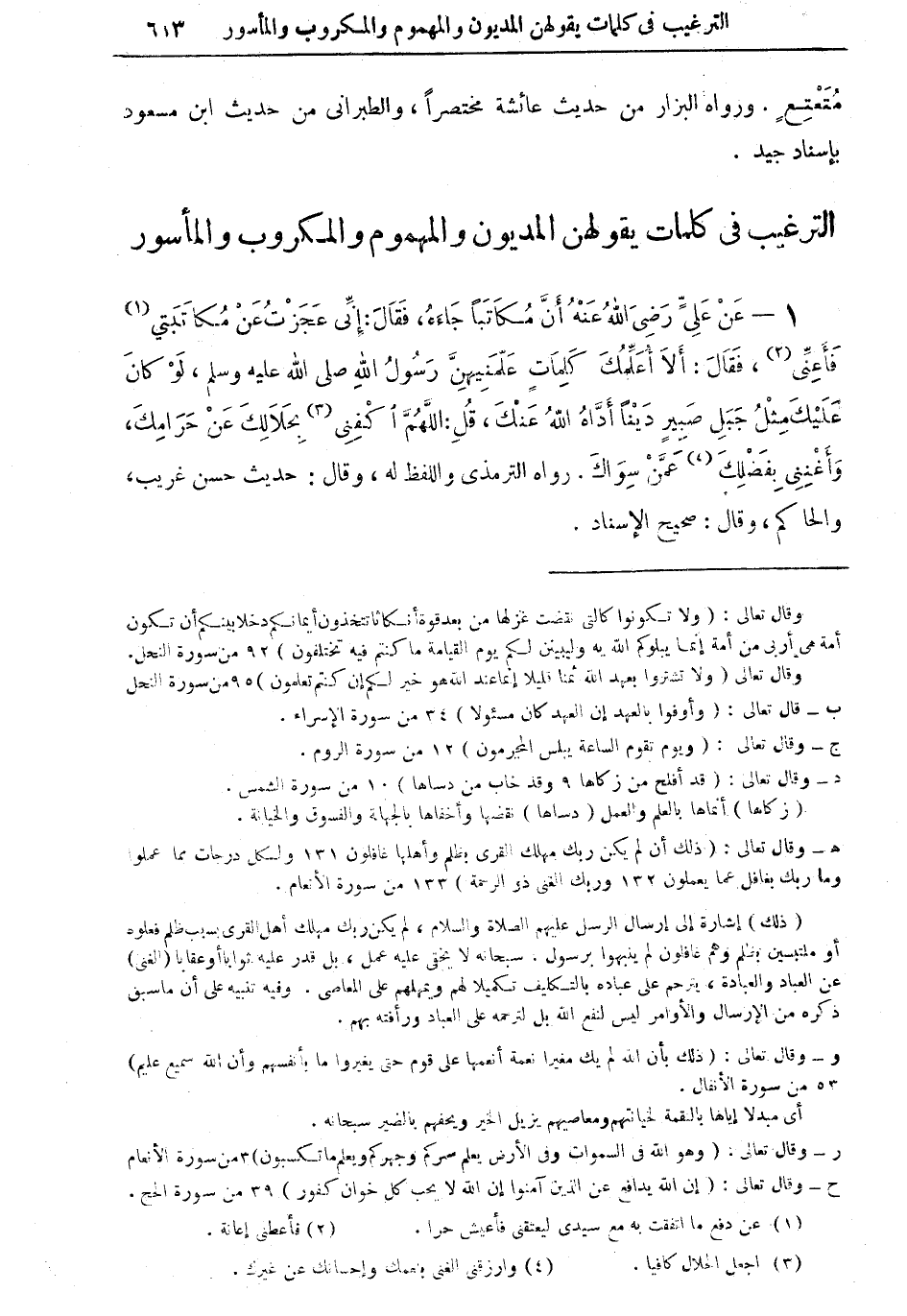 1 - عن علي رضي الله عنه أن مكاتباً جاءه، فقال: إني عجزت عن مكاتبتي (¬1) فأعني (¬2)، فقال: ألا أعلِّمك كلمات علمنيهنَّ رسول الله صلى الله عليه وسلم، لوْ كان عليك مثل جبل صبيرٍ ديناً أدَّاه الله عنك، قل: اللهم اكفني (¬3) بحلالك عن حرامك، وأغنني بفضلك (¬4) عمَّن سواك. رواه الترمذي واللفظ له، وقال: حديث حسن غريب، والحاكم، وقال: صحيح الإسناد.