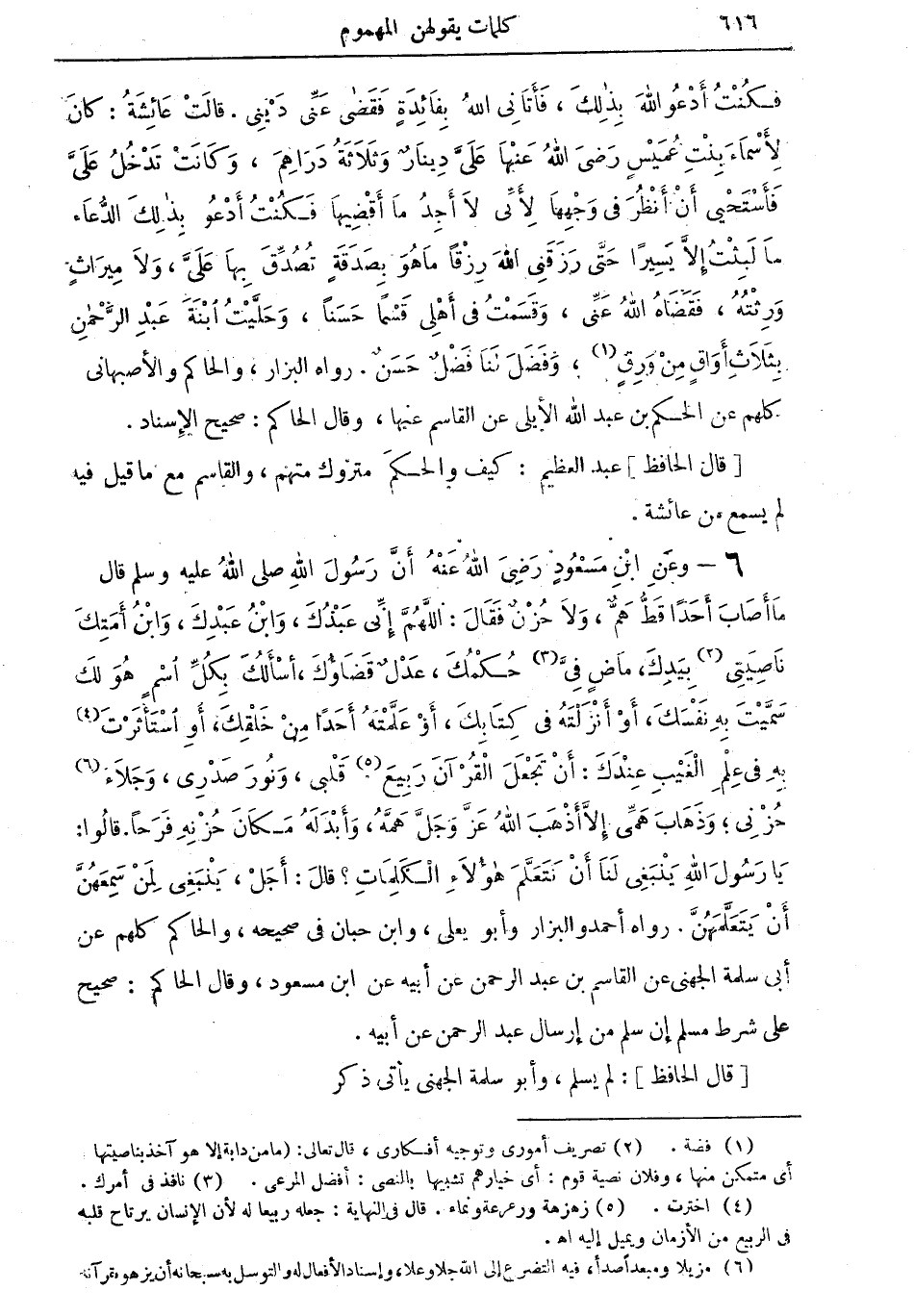 6 - وعن ابن مسعودٍ رضي الله عنه أن رسول الله صلى الله عليه وسلم قال: ما أصاب أحداً قطُّ همٌّ، ولا حزن فقال: اللهمَّ إني عبدك، وابن عبدك، وابن أمتك ناصيتي (¬2) بيدك ماضٍ فيَّ (¬3) حكمك، عدلٌ قضاؤك أسألك بكل اسم هو لك سمَّيتَ به نفسك، أو أنزلته في كتابك، أو علَّمته أحداً من خلقك، أو استأثرت (¬4) به في علم الغيب عندك: أن تجعل القرآن ربيع (¬5) قلبي، ونور صدري، وجلاء (¬6) حزني، وذهاب همَّي إلا أذهب الله عزَّ وجلَّ همَّه، وأبدله مكان حزنه فرحاً. قالوا: يا رسول الله ينبغي لنا أن نتعلم هؤلاء الكلمات؟ قال: أجل، ينبغي لمن سمعهنَّ أن يتعلمهن. رواه أحمد والبزار وأبو يعلي، وابن حبان في صحيحه، والحاكم كلهم عن أبي سلمة الجهني عن القاسم بن عبد الرحمن عن أبيه عن ابن مسعود، وقال الحاكم: صحيح على شرط مسلم إن سلم من إرسال عبد الرحمن عن أبيه.