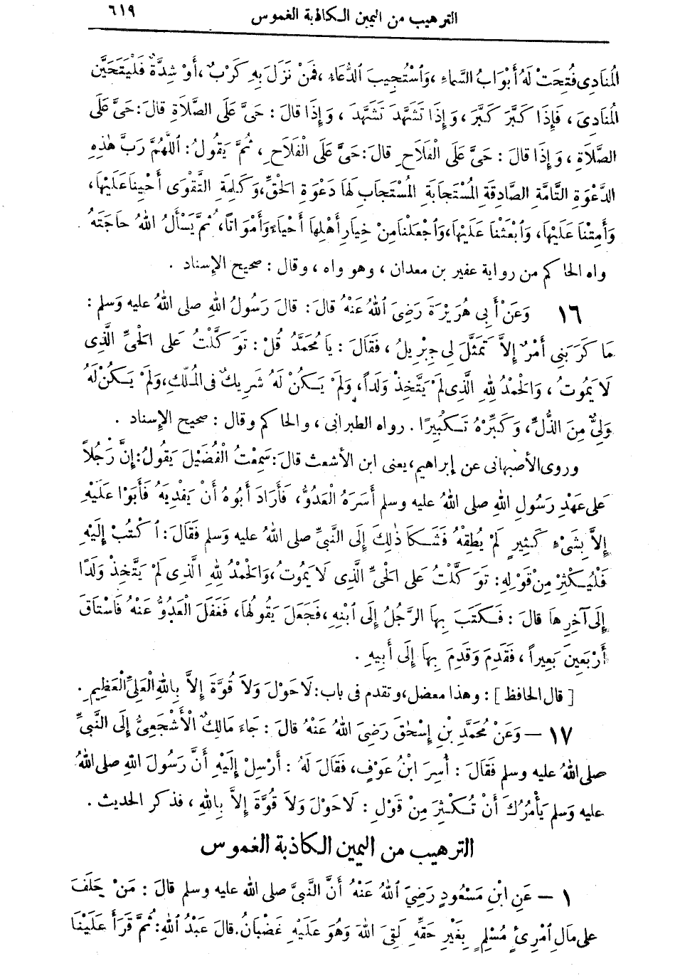 17 - وعن محمد بن إسحاق رضي الله عنه قال: جاء مالك الأشجعيُّ إلى النبي صلى الله عليه وسلم فقال: أسر ابن عوفٍ، فقال له: أرسل إليه أنَّ رسول الله صلى الله عليه وسلم يأمرك أن تكثر من قول: لا حول ولا قوَّة إلا بالله، فذكر الحديث.