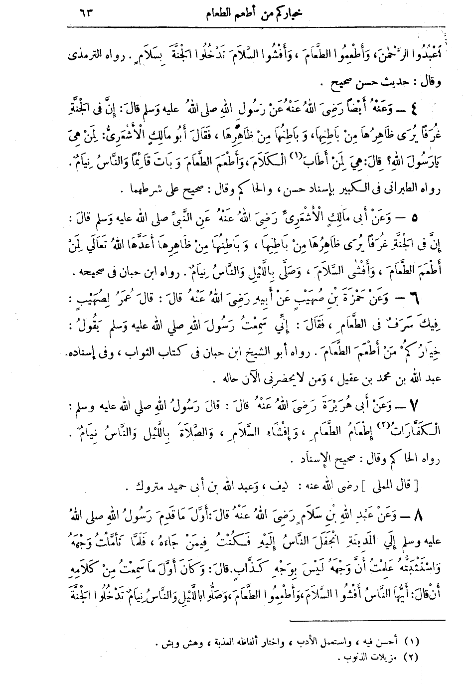 8 - وعنْ عبد الله بن سلامٍ رضي الله عنه قال: أوَّل ما قدم رسول الله صلى الله عليه وسلم إلى المدينة انجفل النَّاس إليه فكُنْتُ فيمن جاءه، فلمَّا تأمَّلتُ وجههُ واستثبتُّه علمت أنَّ وجهه ليس بوجهِ كذَّابٍ. قال: وكان أوَّل ماه سمعت منْ كلامهِ أنْ قال: أيها النَّاس أفشوا السلام، وأطعموا الطعام، وصلُّوا، وصلوا بالليل والناس نيام تداخلوا الجنَّة