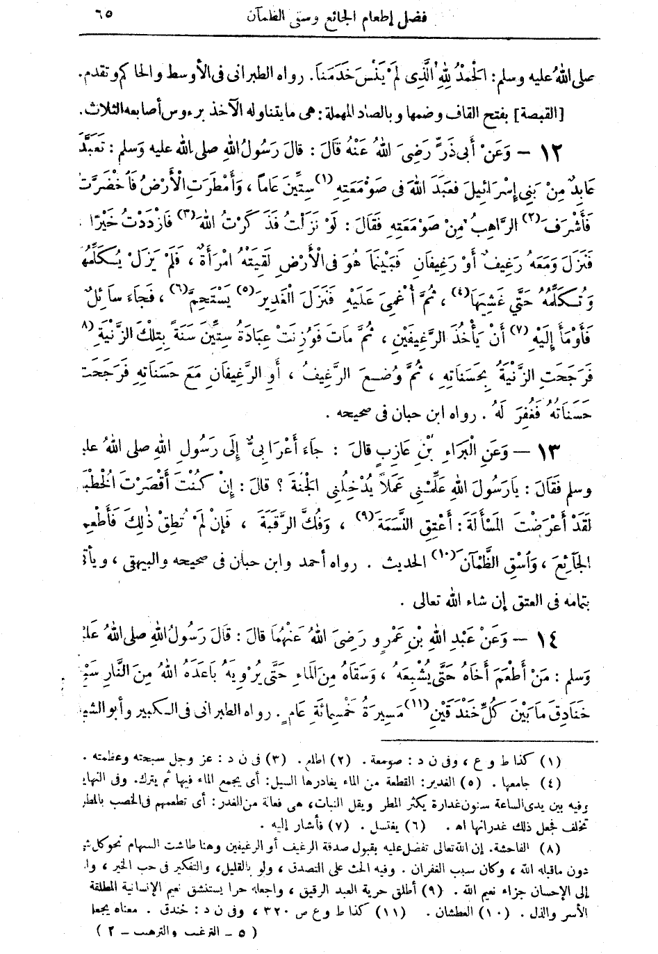 14 - وعنْ عبد الله بن عمرو رضي الله عنهما قال: قال رسول الله صلى الله عليه وسلم: منْ أطعمَ أخاه حتى يشبعه، وسقاه من الماء حتى يرويه باعده الله من النَّار سبع خنادق ما بين كلِّ خندقين (¬11) مسيرة خمسمائة عامٍ. رواه الطبراني في الكبير وأبو الشيخ