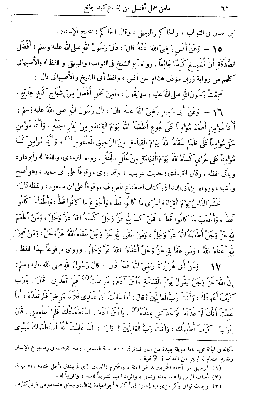 15 - وعنْ أنسٍ رضي اللهه عنه قال: قال رسول الله صلى الله عليه وسلم: أفْضلُ الصَّدقة أن تشبع كبداً جائعاً. رواه أبو الشيخ في الثواب والبيهقي، واللفظ له، والأصبهاني كلهم من رواية زربي مؤذن هشام عن أنس، ولفظ أبي الشيخ والأصبهاني قال: