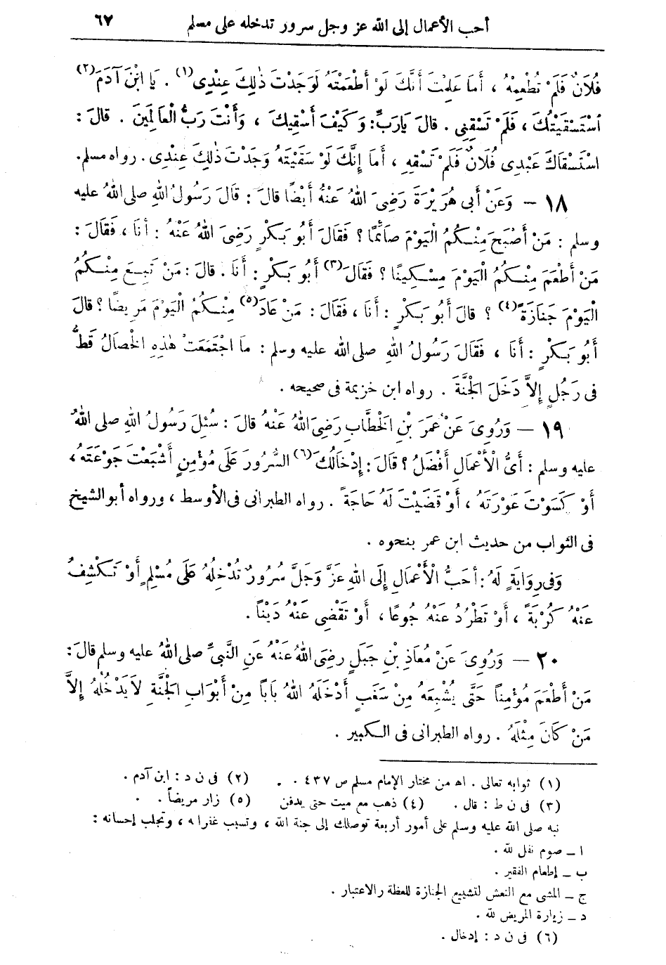 19 - وروى عن عمر بن الخطاب رضي الله عنه قال: سئل رسول الله صلى الله عليه وسلم: أيُّ الأعمال أفضل؟ قال: إدخالك (¬6) السُّرور على مؤمنٍ أشبعْتَ جوْتهُ، أوْ كسوت عورته، أو قضيت له حاجةً. رواه الطبراني في الأوسط، ورواه أبو الشيخ في الثواب من حديث ابن عمر بنحوه.