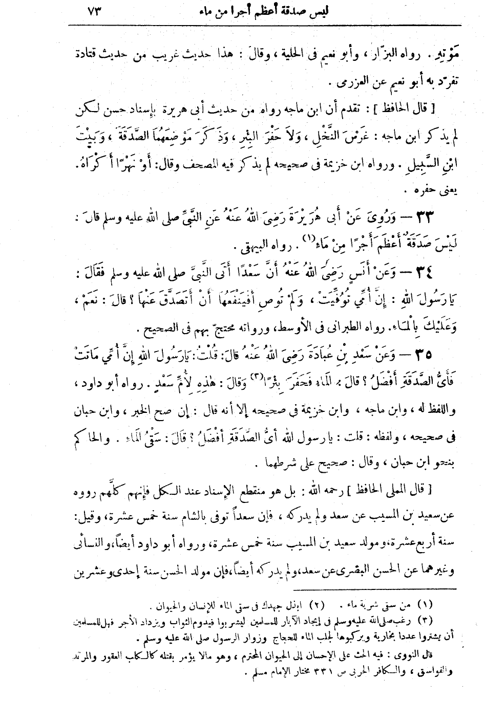 34 - وعنْ أنس رضي الله عنه أنَّ سعْداً أتى النَّبيَّ صلى الله عليه وسلم فقال: يا رسول الله: إنَّ أمِّي توُفيتْ، ولمْ توصِ أفينفعها أنْ أتصدَّق عنها؟ قال: نعمْ، وعليكَ بالماء (¬2). رواه الطبراني في الأوسط، ورواته محتجّ بهم في الصحيح.