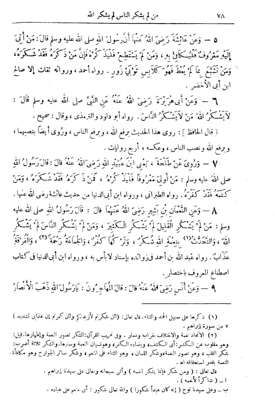 8 - وعن النُّعمان بن بشيرٍ رضي الله عنهما قال: رسول الله صلى الله عليه وسلم: منْ لمْ يشكُرِ القليل لم يشكُرِ الكثير، ومنْ لمْ يشكرِ النَّاس لم يشكر الله، والتَّحدثُ (¬1) بنعمة الله شكر، وترْكها كفر، والجماعة رحمةٌ (¬2)، والفرقة عذاب. رواه عبد الله بن أحمد في زوائده لا بأس به، ورواه ابن أبي الدنيا في كتاب اصطناع المعروف باختصار.