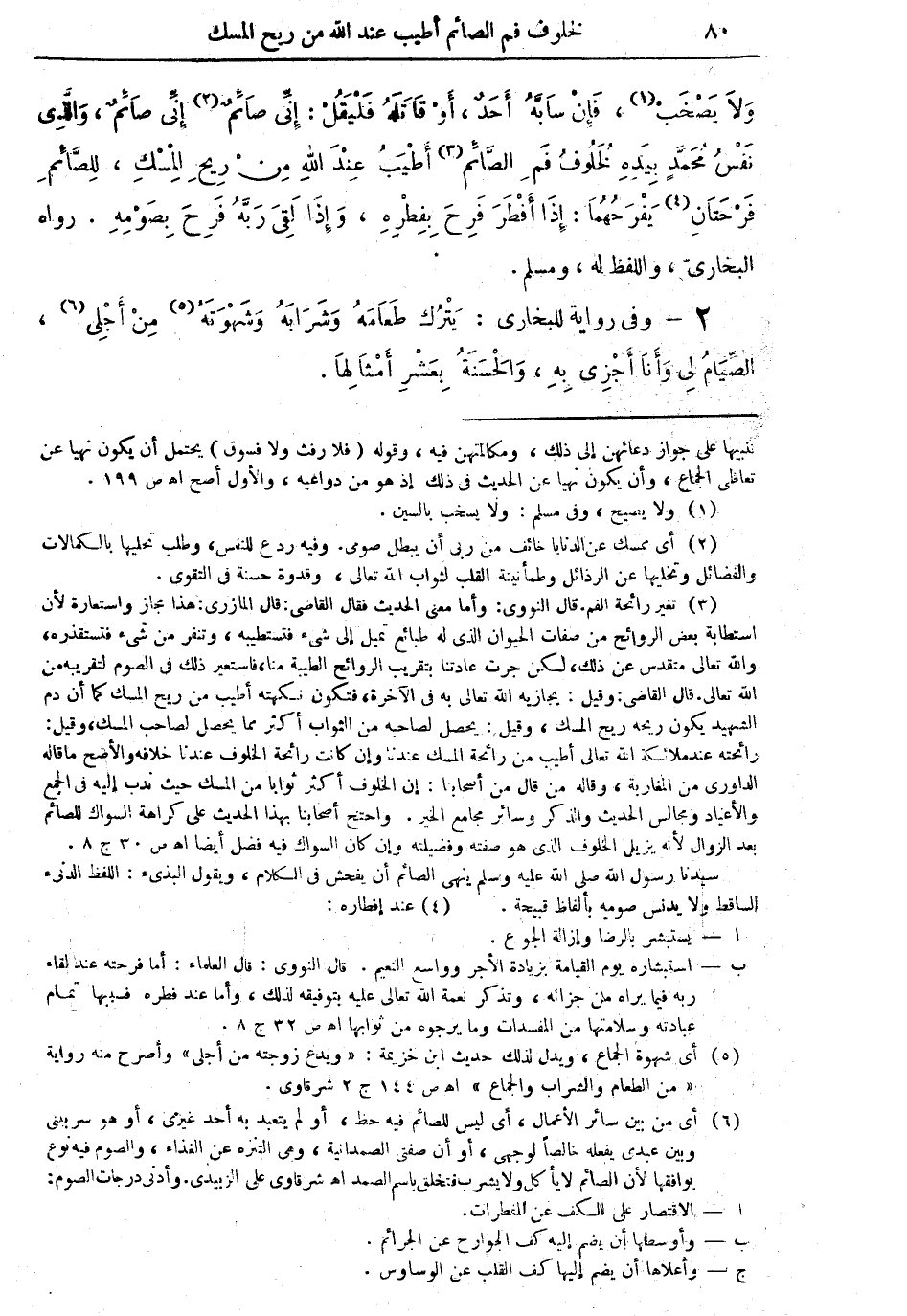 (¬3) تغير رائحة الفم. قال النووي: وأما معنى الحديث فقال القاضي قال المازري: هذا مجاز واستعارة لأن استطابة بعض الروائح من صفات الحيوان الذي له طبائع تميل إلى شيء فتستطيبه، وتنفر من شيء فتستقذره، والله تعالى متقدس من ذلك، لكن جرت عادتنا بتقريب الروائح الطيبة منا، فاستعير ذلك في الصوم لتقريبه من الله تعالى. قال القاضي: وقيل: يجازيه الله تعالى به في الآخرة، فتكون نكهته أطيب من ريح المسك كما أن دم الشهيد يكون ريحه ريح المسك، وقيل: يحصل لصاحبه من الثواب أكثر مما يحصل لصاحب المسك، وقيل: رائحته عند ملائكة الله تعالى أطيب من رائحة المسك عندنا وإن كانت رائحة الخاوف عند خلافه، والأصح ما قاله الداوري من المغاربة، وقال من قال من أصحابنا: إن الخلوف أكثر ثوابا من المسك حيث ندب إليه في الجمع، والأعياد، ومجالس الحديث والذكر، وسائر مجامع الخير، واحتج أصحابنا بهذا الحديث على كراهة السواك للصائم بعد الزوال لأنه يزيل الخلوف الذي هو صفته وفضيلته، وإن كان السواك فيه فضل أيضا أهـ ص 30 جـ 8.