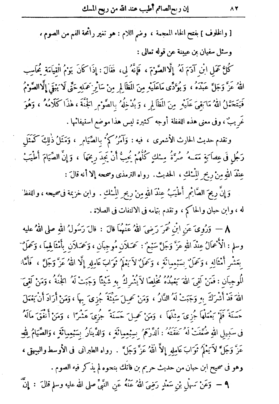 8 - وروي عنْ ابن عمر رضي الله عنهما قال: قال رسول الله صلى الله عليه وسلم: الأعمال عند الله عزَّ وجلَّ سبع: عملان موجبان، وعملان بأمثالهما، وعمل بعشر أمثاله، وعمل بسبعمائةٍ، وعمل لا يعلم ثواب عاملهِ إلا الله عزَّ وجلَّ، فأمَّا الموجبان: فمن لقي الله يعبده مخلصاً لا يشرك به شيئاً وجبت له الجنَّة، ومن لقي الله قد أشرك به وجبت له النار، ومن عمل سيئةً جزي بها، ومن أراد أن يعمل حسنةً فلم يعملها جزي مثلها، ومنْ عمل حسنة جزي عشرا، ومن أنفق ماله في سبيل الله ضُعِّفت له نفقته: الدِّرْهم بسبعمائةٍ، والدينار بسبعمائةٍ، والصيام لله عزَّ وجلَّ لا يعلم ثواب عامله إلا الله عزَّ وجلَّ. رواه الطبراني في الأوسط والبيهقي، وهو في صحيح ابن حبان من حديث حريم بن فاتك بنحو لم يذكر فيه الصوم.