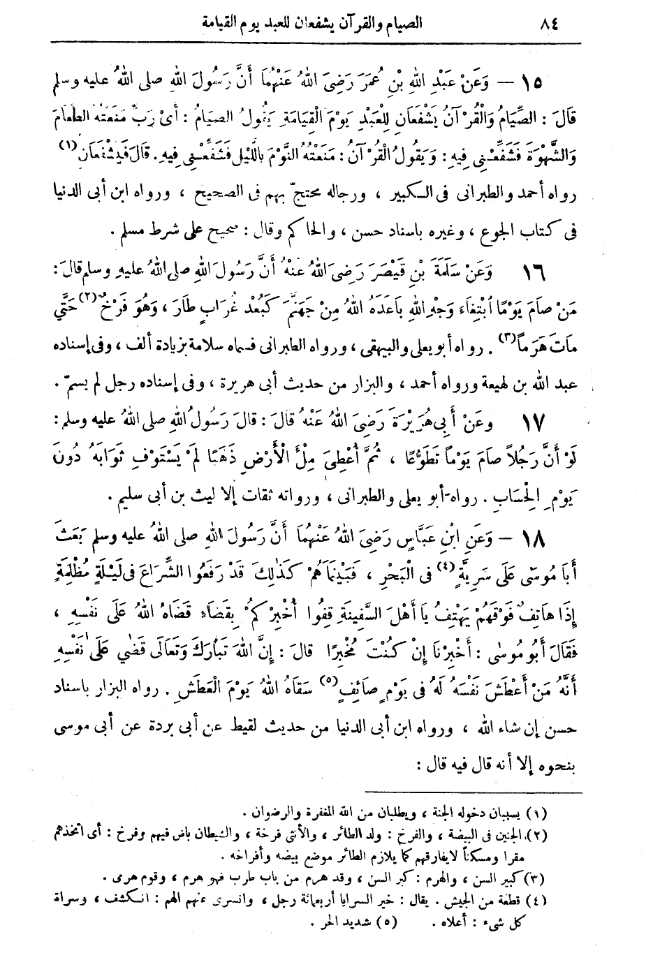 15 - وعنْ عبد الله بن عمر رضي الله عنهما أنَّ رسول الله صلى الله عليه وسلم قال: الصِّيام والقرآن يشفعان للعبد يوم القيامة يقول الصيام: أي ربِّ منعته الطعام والشَّهوة فشفعني فيه: ويقول القرآن: منعته النَّوم بالليل فشفعني فيه. قال فيشفعان (¬1): رواه أحمد والطبراني في الكبير، ورجاله محتجّ بهم في الصحيح، ورواه ابن أبي الدنيا في كتاب الجوع، وغيره بإسناد حسن، والحاكم وقال: صحيح على شرط مسلم.