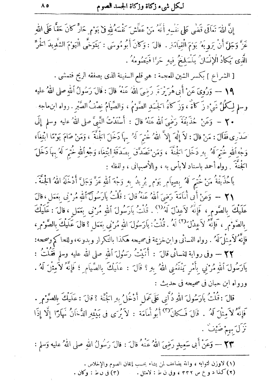 19 - وروي عنْ أبي هريرة رضي الله عنه قال: قال رسول الله صلى الله عليه وسلم: لكلِّ شيءٍ زكاة، وزكاة الجسد الصَّوم، والصِّيام نصف الصَّبْرِ. رواه ابن ماجه.