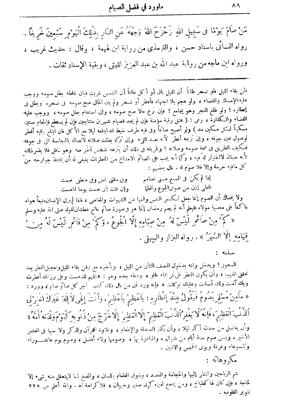 منْ صام يوماً في سبيل الله زحزح الله وجهه عن النَّار بذلك اليوم سبعين خريفاً رواه النسائي بإسناد حسن، والترمذي من رواية ابن لهيعة، وقال: حديث غريب ورواه ابن ماجه من رواية عبد الله بن عبد العزيز الليثي، وبقية الإسناد ثقات.