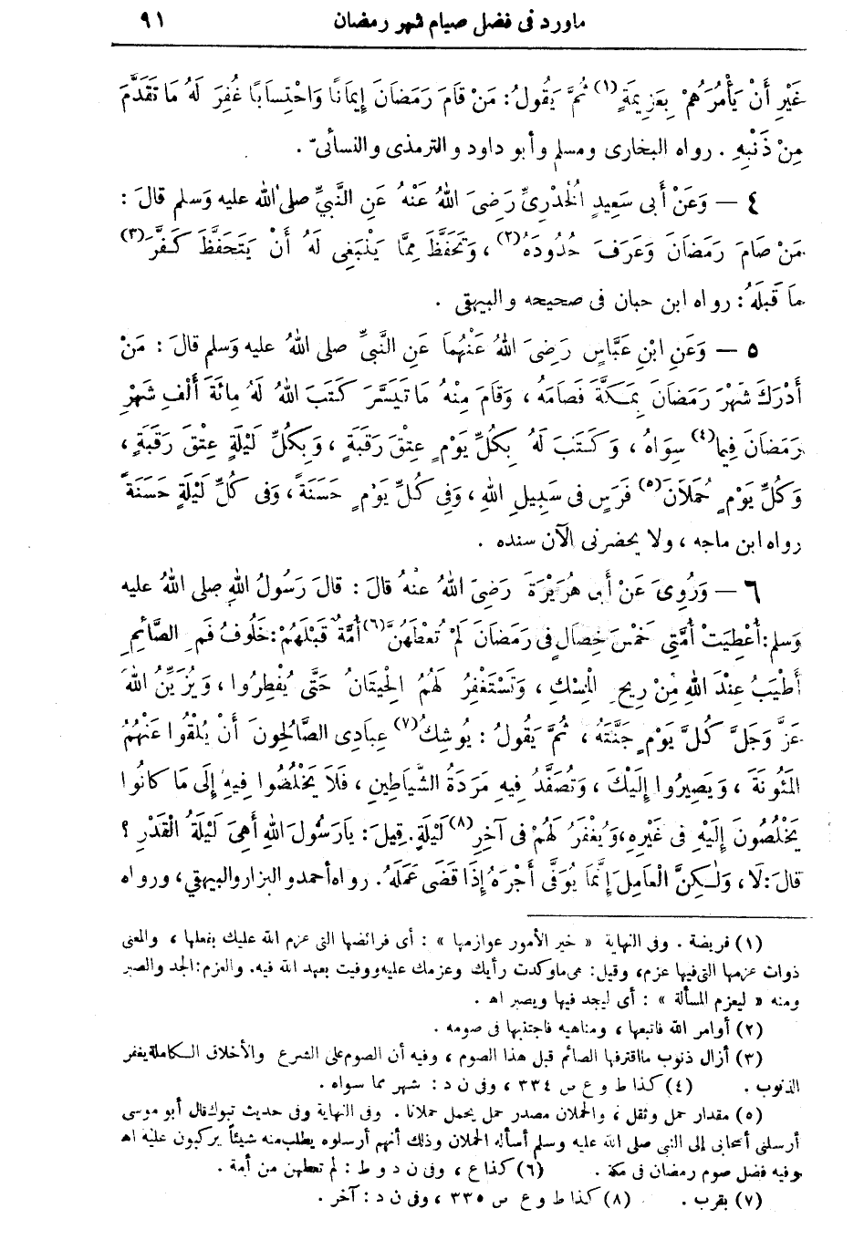 5 - وعن ابن عباس رضي الله عنهما عن النبيِّ صلى الله عليه وسلم قال: ومنْ أدرك شهر رمضان بمكَّة فصامَهُ، وقام منه ما تيسَّر كتب الله له مائة ألف شهر رمضان فيما (¬4) سواه، وكتب له بكلِّ يومٍ عتق رقبةٍ، وبكلِّ ليلةٍ عتقَ رقبةٍ، وكلِّ يومٍ حملان (¬5) فرسٍ في سبيل الله، وفي كلِّ يومٍ حسنةً، وفي كلِّ ليلة حسنةً. رواه ابن ماجه، ولا يحضرني الآن سنده.