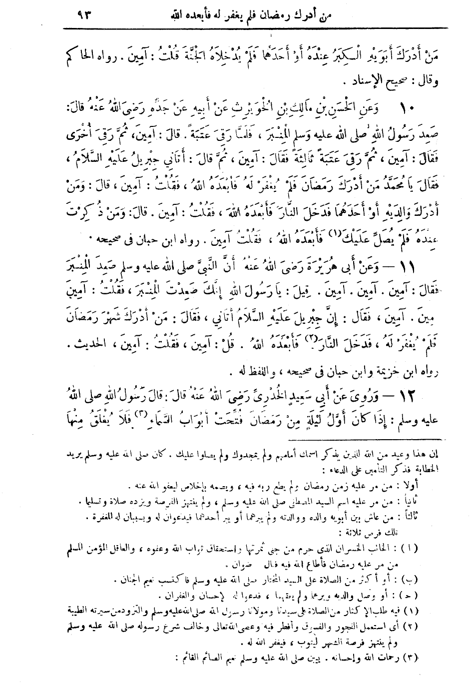 10 - وعن الحسن بن مالك بن الحويرثِ عن أبيه عن جدِّه رضي الله عنه قال: صعد رسول الله صلى الله عليه وسلم المنبر، فلما رقى عتبةً. قال: آمين، ثمَّ رقى أخرى فقال: آمين، ثمَّ رقى عتبة ثالثة فقال: آمين، ثم قال: أتاني جبريل عليه السلام، فقال: يا محمَّد من أدرك رمضان فلمْ يغفرْ له فأبعده الله، فقلتٌ: آمين. قال: ومنْ ذكرتَ عندهُ فلمْ يُصلِّ عليك (¬1) فأبعده الله، فقلت آمين. رواه ابن حبان في صحيحه.