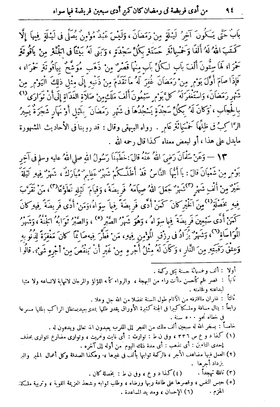 13 - وعنْ سلمان رضي الله عنه قال: خطبنا رسول الله صلى الله عليه وسلم في آخر يومٍ منْ شعبان قال: يا أيُّها النَّاس قد أظلَّكمْ شهرٌ عظيمٌ مباركٌ، شهر فيه ليلة خير من ألف شهرٍ (¬2) شهر جعل الله صيامه فريضةً، وقيام ليله تطوعاً (¬3)، من تقرَّبَ فيه بخصلةٍ (¬4) من الخيرِ كان كمنْ أدَّى فريضةً فيما سواه، ومن أدَّى فريضةً فيه كان كمن أدَّى سبعين فريضة فيما سواه، وهو شهر الصَّبر (¬5)، والصَّبر ثوابه الجنَّة، وشهرُ المواساةِ (¬6)، وشهر يزاد في رزق المؤمنِ فيه، من فطَّر فيه صائماً كان مغفرةً لذنوبهِ وعتقَ رقبته من النَّار، وكان له مثل أجره من غير أن ينقص من أجره شيء. قالوا