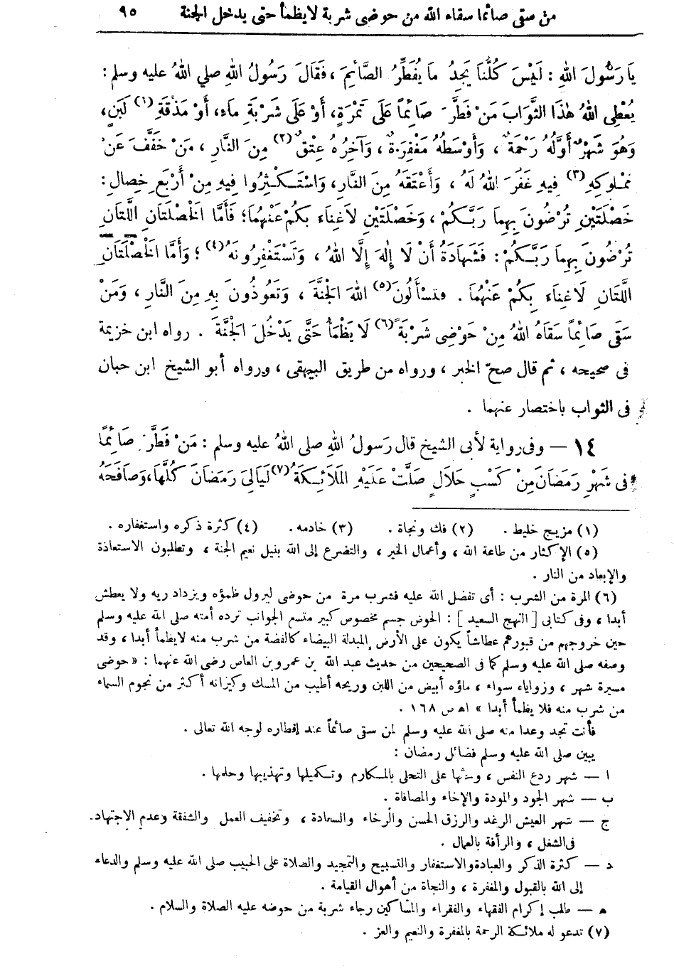 (¬6) المرة من الشرب: أي تفضل الله عليه فشرب مرة من حوضي ليزول ظمؤه، ويزداد ريه، ولا يعطش أبداً، وفي كتابي (النهج السعيد): الحوض جسم مخصوص كبير متسع الجوانب ترده أمته صلى الله عليه وسلم حين خروجهم من قبورهم عطاشاً يكون على الأرض المبدلة البيضاء كالفضة من شرب منه لا يظمأ أبداً، وقد وصفه صلى الله عليه وسلم كما في الصحيحين من حديث عبد الله بن عمرو بن العاص رضي الله عنهما: (حوضي مسيرة شهر، وزواياه سواء، ماؤه أبيض من اللبن، وريحه أطيب من المسك، وكيزانه أكثر من نجوم السماء، من شرب منه فلا يظمأ أبداً) أهـ ص 168.