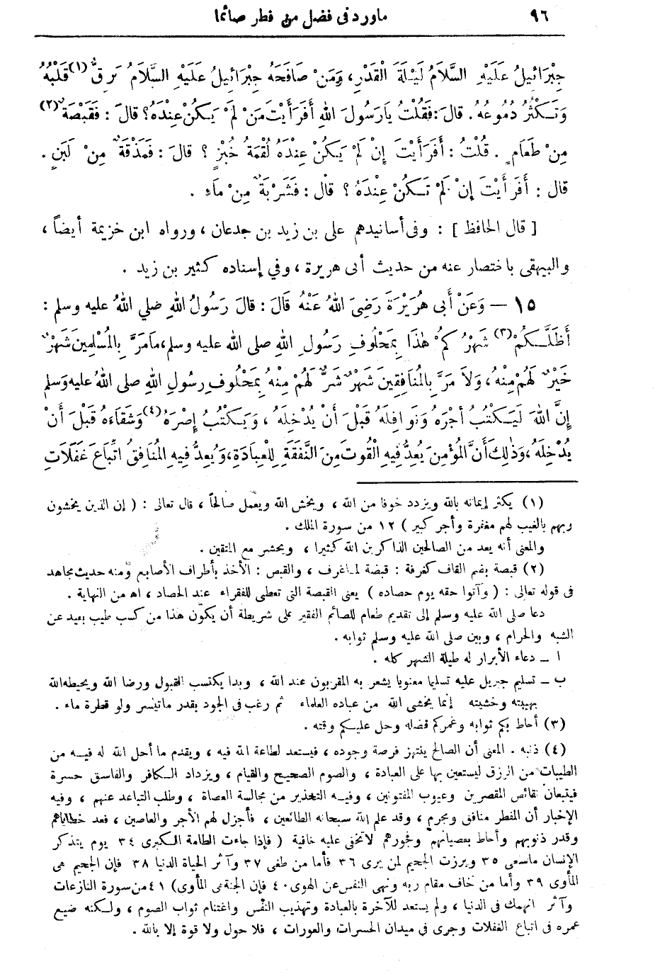 (¬4) ذنبه. المعنى أن الصالح ينتهز فرصة وجوده، فيستعد لطاعة الله فيه، ويقدم ما أحل الله له فيه من الطيبات من الرزق ليستعين بها على العبادة، والصوم الصحيح والقيام، ويزداد الكافر والفاسق حسرة، فيتبعان نقائص المقصرين، وعيوب المفتونين، وفيه التحذير من مجالسة العصاة، وطلب التباعد عنهم، وفيه الإخبار أن المفطر منافق ومجرم، وقد علم الله سبحانه الطائعين، فأجزل لهم الأجر والعاصين، فعد خطاياهم وقدر ذنوبهم، وأحاط بعصيانهم وفجورهم ولا تخفي عليه خافية (فإذا جاءت الطامة الكبرى 34 يوم يتذكر الإنسان ما سعي 35 وبرزت الجحيم لمن يرى 36 فأما من طغى 37 وآثر الحياة الدنيا 38 فإن الجحيم هي المأوى 39 وأما من خاف مقام ربه ونهى النفس عن الهوى 40 فإن الجنة هي المأوى) 41 من سورة النازعات. (وآثر) انهمك في الدنيا، ولم يستعد للآخرة بالعبادة، وتهذيب النفس، واغتنام ثواب الصوم، ولكنه ضيع عمره في اتباع الغفلات وجرى في ميدان الحسرات والعورات، فلا حول ولا قوة إلا بالله.