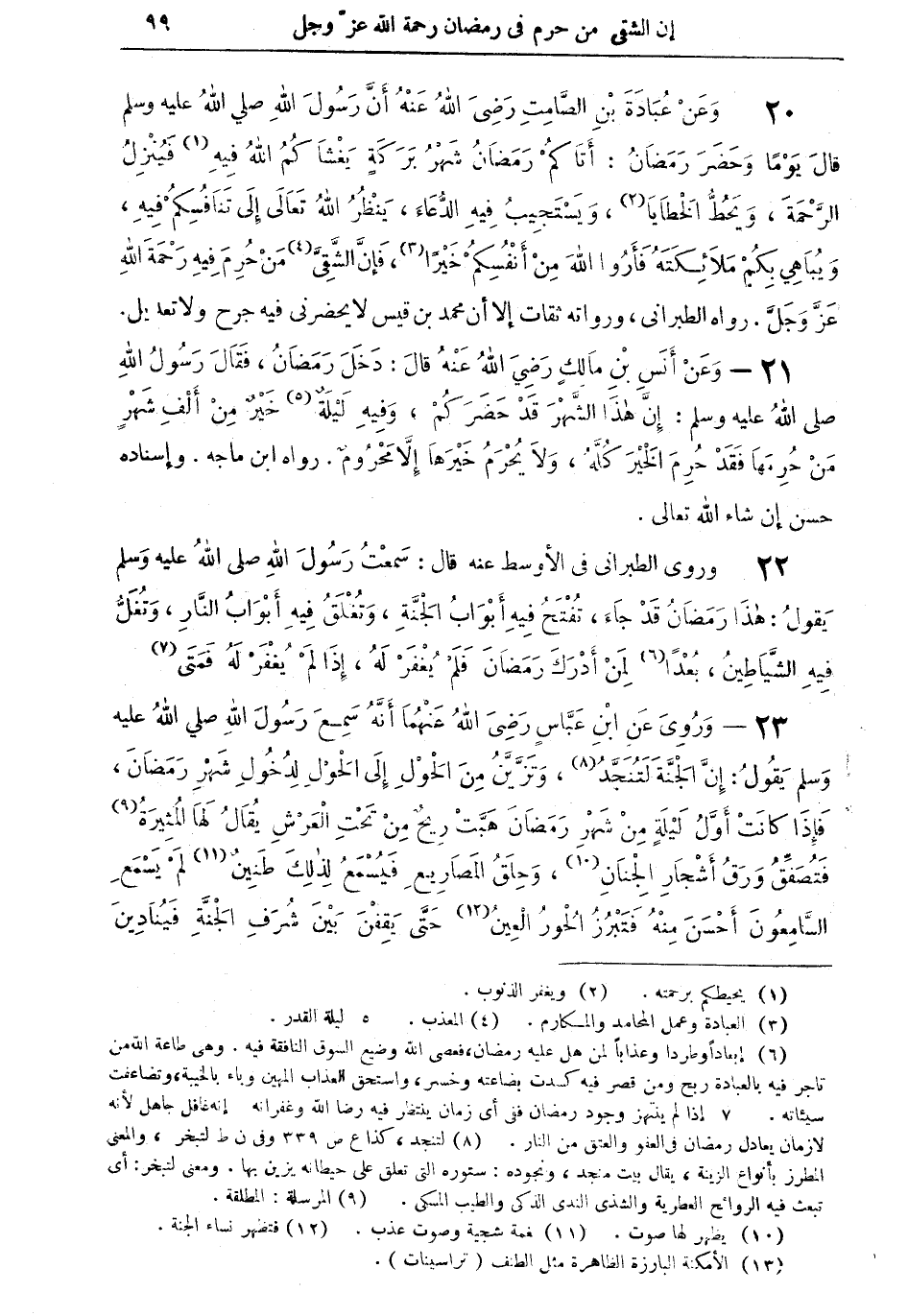 21 - وعنْ أنسِ بن مالكٍ رضي الله عنه قال: دخل رمضان، فقال رسول الله صلى الله عليه وسلم: إنَّ هذا الشهر قد حضركمْ، وفيه ليلة (¬5) خير من ألف شهرٍ من حرمها فقد حرم الخير كلَّه، ولا يحرم خيرها إلا محروم. رواه ابن ماجه. وإسناده حسن إن شاء الله تعالى.