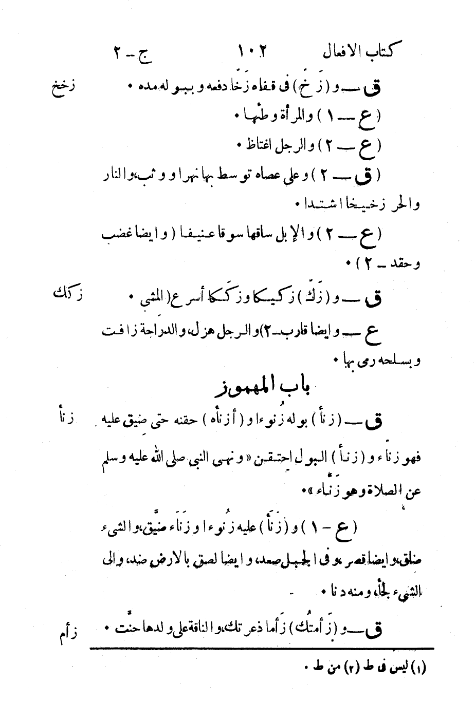 ع -1 و"زَنَأ" عليه زُنوءا وزَنَاء ضيَّق والشء ضاق وأيضا قصر وفي الجبل صعد وأيضا لصق بالأرض ضد وإلى الشيء لجأ منه دنا.