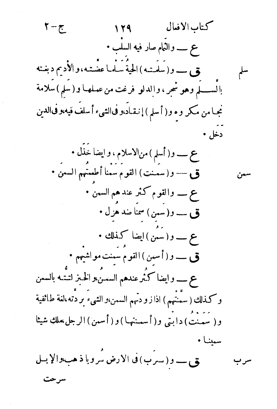 ع - وأيضا كثُر عمدهم السمنُ والخبز لتتُّه بالسمن وكذلك "سمَّنْتهم" إذا زودتهم السمن والشيءَ بردَّته لغة طائفية و"سَمَنْتُ" دابّتي و"أسمنتها" و"أسمن" الرجل ملك شيئا سمينا.