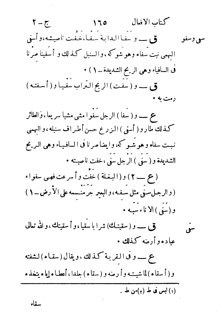 ع -2 و"البغلة" خَفَّت وأسرعت فهي سفواء "والرجل سفَى مثل سَفِه والبعير حَرّ مَنْسِمه على الأرض"1 و"سَفَى" الإناء سَبّه.