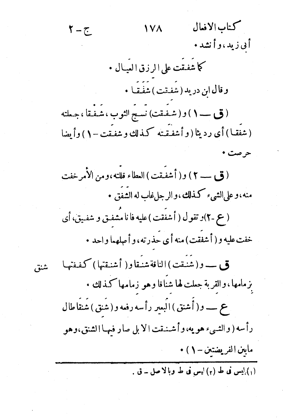 ع -2 وتقول "أشفَقت" عليه فأنا مُشفِق وشفيق أي خفت عليه و"أشفَقت" منه أي حَذِرته وأصلهما واحد.
