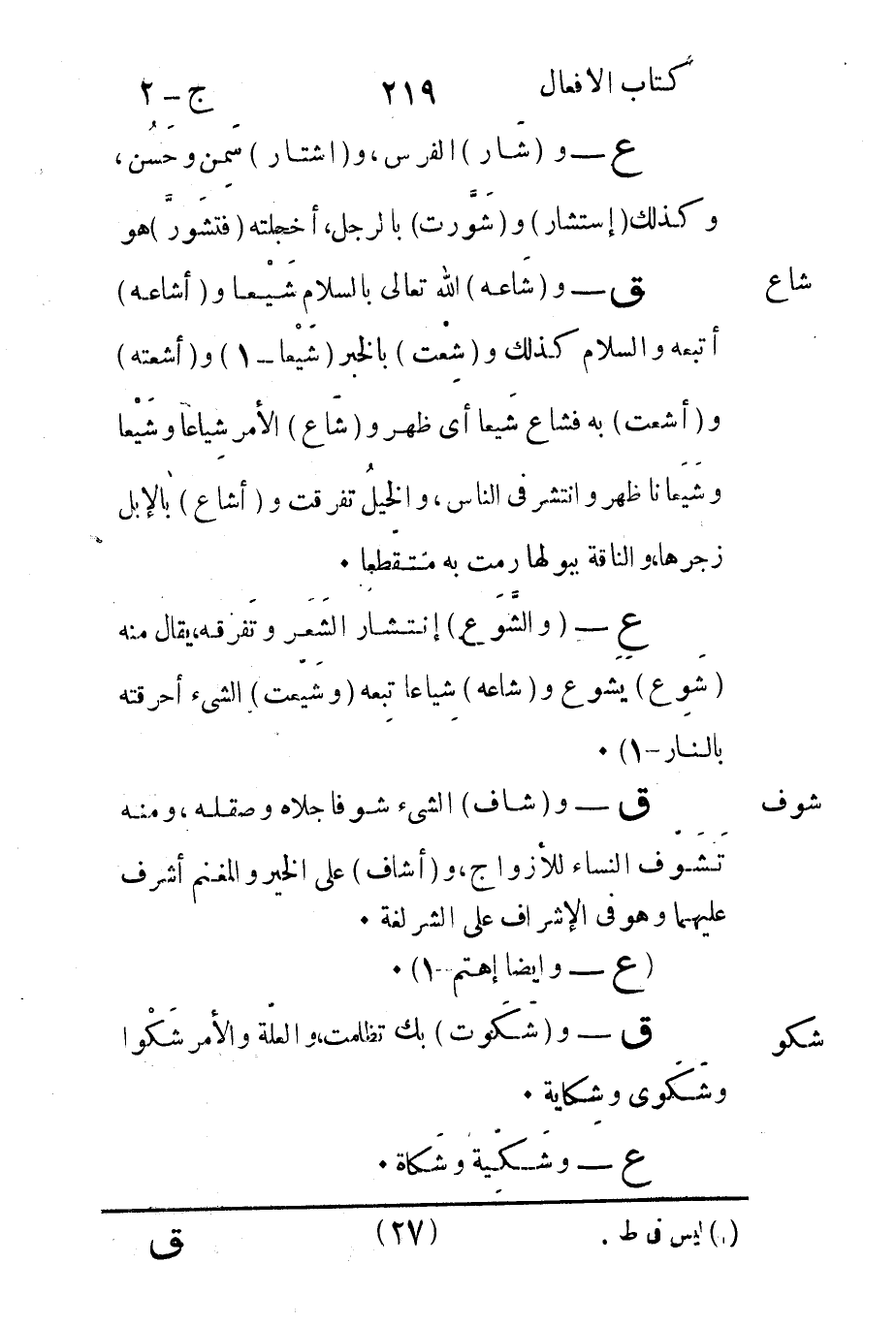 شَاع: ق - و"شَاعه" الله تعالى بالسلام شَيْعا و"أشاعه" أتبعه والسلام كذلك و"شِعْت" بالخبر "شَيْعا1" و"أشعته" و"أشعت" به فشاع شَيعا أي ظهر و"شَاع" الأمر شِياعا وشَيْعا وشَيعَانا ظهر وانتشر في الناس والخيلُ تفرقت و"أشاع" بالابل زجرها والناقة ببولها رمت به متقطعاً.