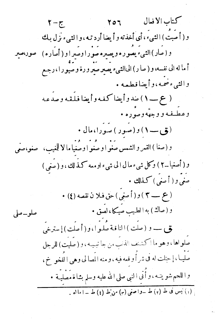 صَلو, وصَلى: ق - و"صلَت" الناقة صُلوّا و"أصلَت" إسترخىَ صَلواها وهو وهو ما اكتنف الذنبَ من جانبيه و"صَليَت" للرجل صَلْيا إجتلت له في شرأُ وقعِه فيه ومنه المَصالى وهي الفَخوخ واللحم شويته وأُتى النبي ص - بشاة مَصْلِيّة.