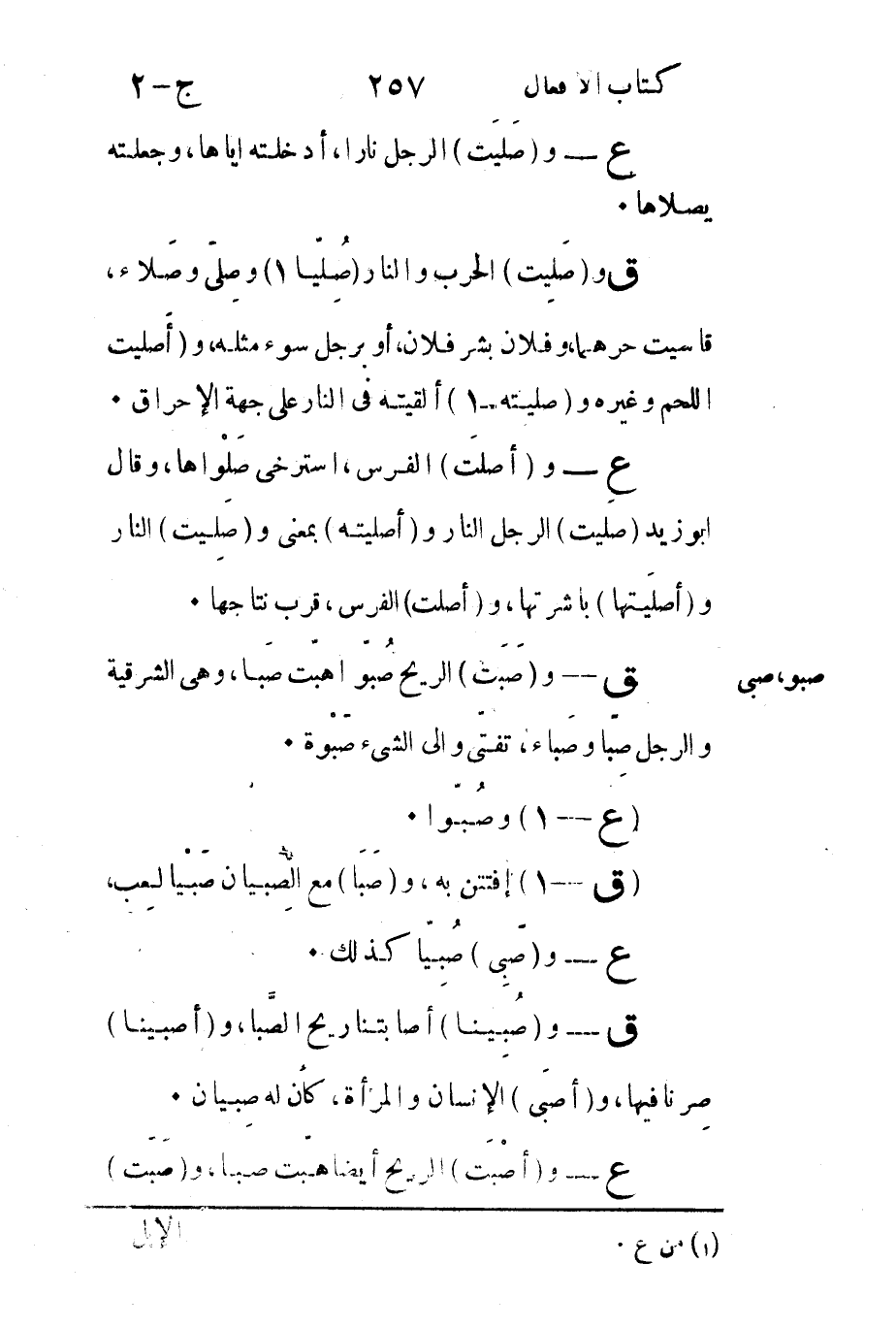 ق - و"صَليِت" الحرب والنار "صُلِيّا"1 وصِلّى وصَلاء قاسيت حرهما وفلان بشر فلان أو برجل سوء مثله و"أَصليت اللحم وغيره وصليته1 ألقيته في النار على جهة الاحراق.