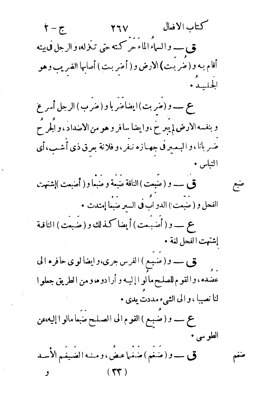 ق - و"ضَبَع" الفرس جرى وأيضا لوى حافره إلى عَضُده والقوم للصلح مالُوا إليه وأرادوه من الطريق جعلوا لنا نصيبا والى الشيء مددتُ يدى.