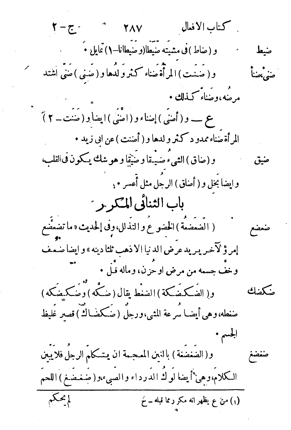 ع - و"أضنىَ" إضناء و"ضَّنى" أيضا و"ضَنَت"2 المرأة ضَناء ممدود كثر ولدها و"أضنت" عن أبي زيد.