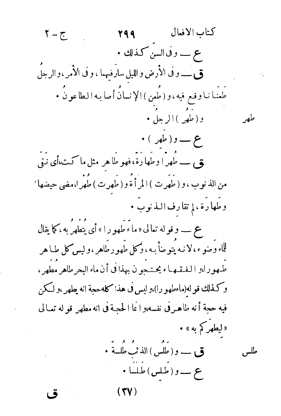 ع - وقوله تعالى: {مَاءً طَهُوراً} أي يُتطّهرُ به كما يقال للماءَ وَطوء لانه يُتوضأ به وكل طَهور طَاهر وليس كل طاهر طَهورا والفقهاء يحتجّون بهذا في أن ماء البحر طاهر مُطهّر وكذلك قوله "ماء طهورا" وليس في هذا كله حجة انه يطهر ولكن في حجة أنه طاهر في نفسه وانما الحجة في انه مطهر قوله تعالى: {لِيُطَهِّرَكُمْ بِهِ} .