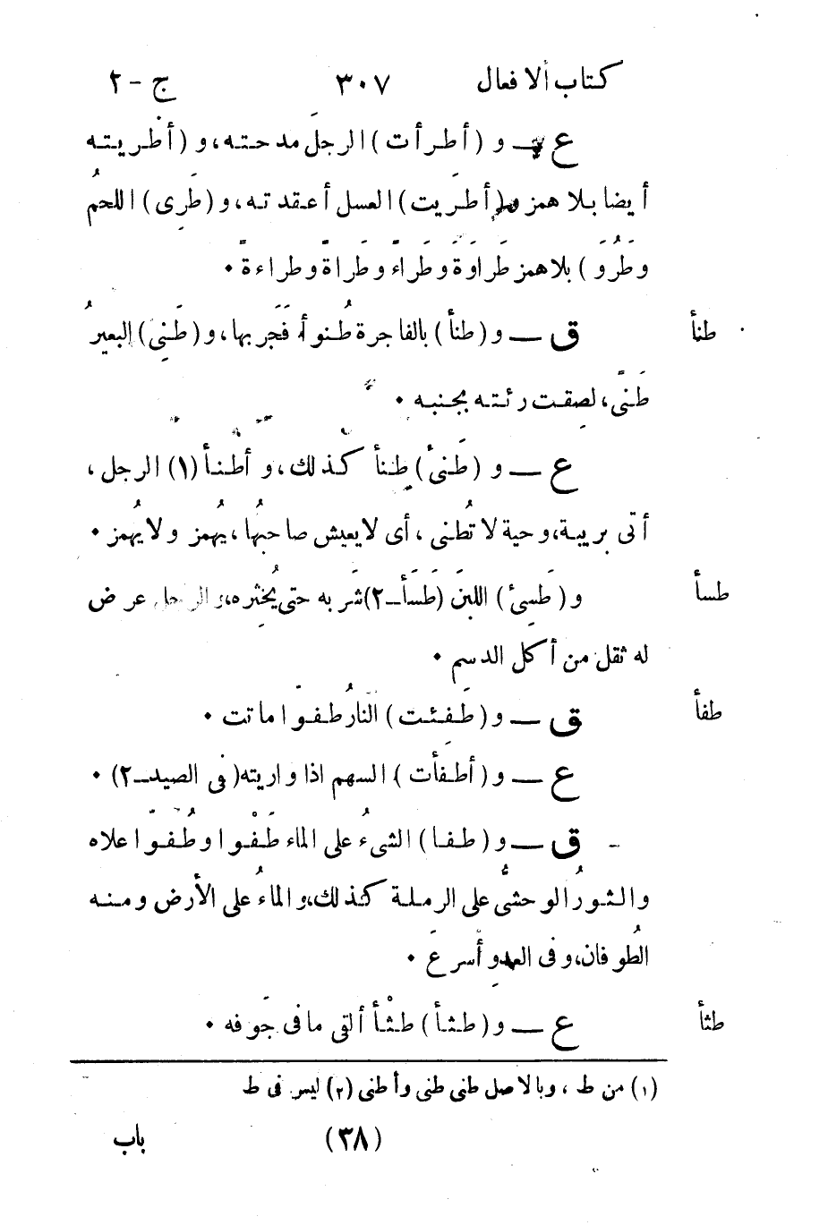 ع - و"طَنئ" طنأ كذلك وأطنأ1 الرجل أتى بريبة وحية لا تُطنى أي لا يعيش صاحبُها يُهمز ولا يُهمز.