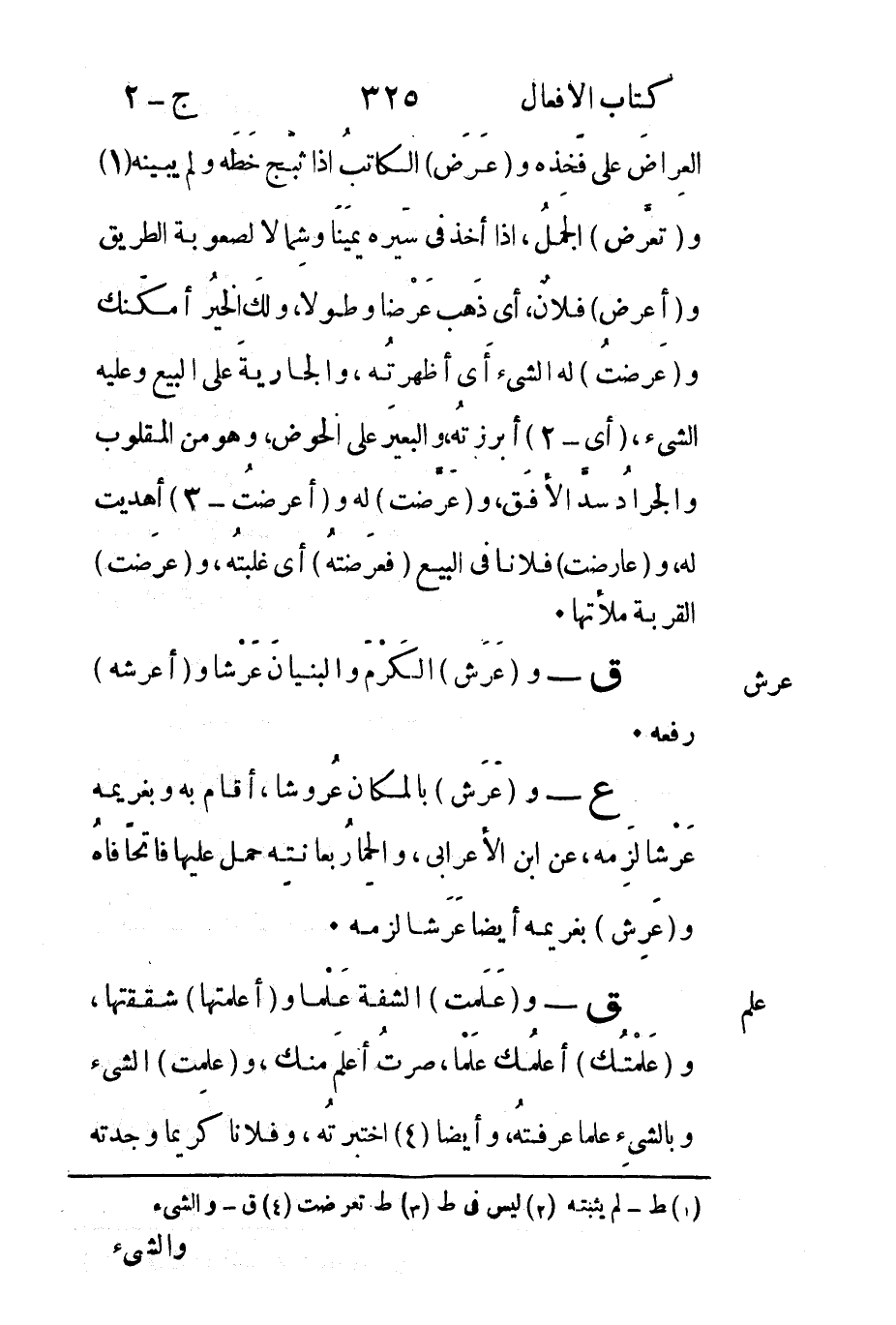 العِراضَ على فَخذِه و"عَرَض" الكاتبُ إذا ثبّج خَطَه ولم يبينه1 و"تعرَّض" الجملُ إذا أخذ في سَيره يَميناً وشِمالاً لصعوبة الطريق و"أعرض" فلانٌ أي ذَهب عَرْضا وطولاَ ولكَ الخيرُ أمكَنك و"عَرضتُ" له الشيء أَي أظهرتُه والجاريةَ على البيع وعليه الشيء أي2 أبرزتُه والبعيرَ على الحوض وهو من المقلوب والجرادُ سدَّ الأفقَ و"عَرَّضت"3 له و"أعرضتُ" أهديت له و"عارضت" فلاناً في البيع "فعرَضتهُ" أي غلبتُه و"عرضَت" القربة ملأتها.