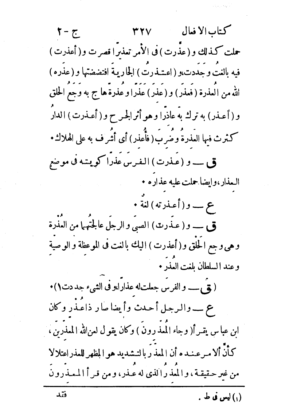 ع - والرجل أحدثُ وأيضاً صار ذا عُذْرٍ وكان ابن عباس يقرأ "وجاء المُعذَرونَ" وكان يقول لعن الله المعذِرّينَ كأنَّ ألامر عنده أن المعذّرَ بالتشديد هو المظهر للعذر اعتلالا من غير حقيقة والمُعّذِرُ الذي له عُذر ومن قرأ المعذِرَون.
