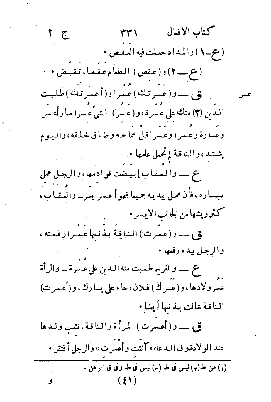 ق - و"عَسَرتك" عُسْرا و"أعسرتك" طلبت الدَين3 منك على عُسْرة و"عَسِرُ" الشيء عُسرا صار أعسرَ وعَسارة وعُسرا وعَسَرا قلَّ سَماحه وضاق خلقه واليوم إشتد والناقة لم تحمل عامها.