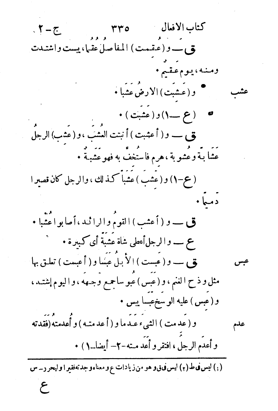 ع -1 و"عَشِبَ" عَشَباً كذلك والرجل كان قصيرا دَميماً.