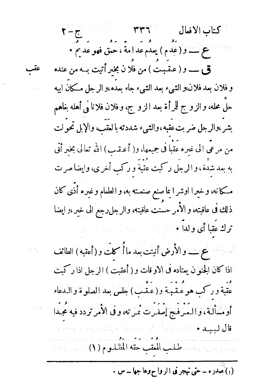 ع - والأرض أنبتت بعد ما أُكِلَت و"أعقبه" الطائف إذا كان الجنون يعتاده في الأوقات و"أعقبتَ" الرجل إذا ركبت عُقَبة ورِكب هو عٌقْبَة و"عَقَّب" جلس بعد الصلاة والدعاء أو مسألة والعَرْفَج إصْفَرّت ثمرته وفي الأمر تردد فيه مُجِداّ قال لبيد.